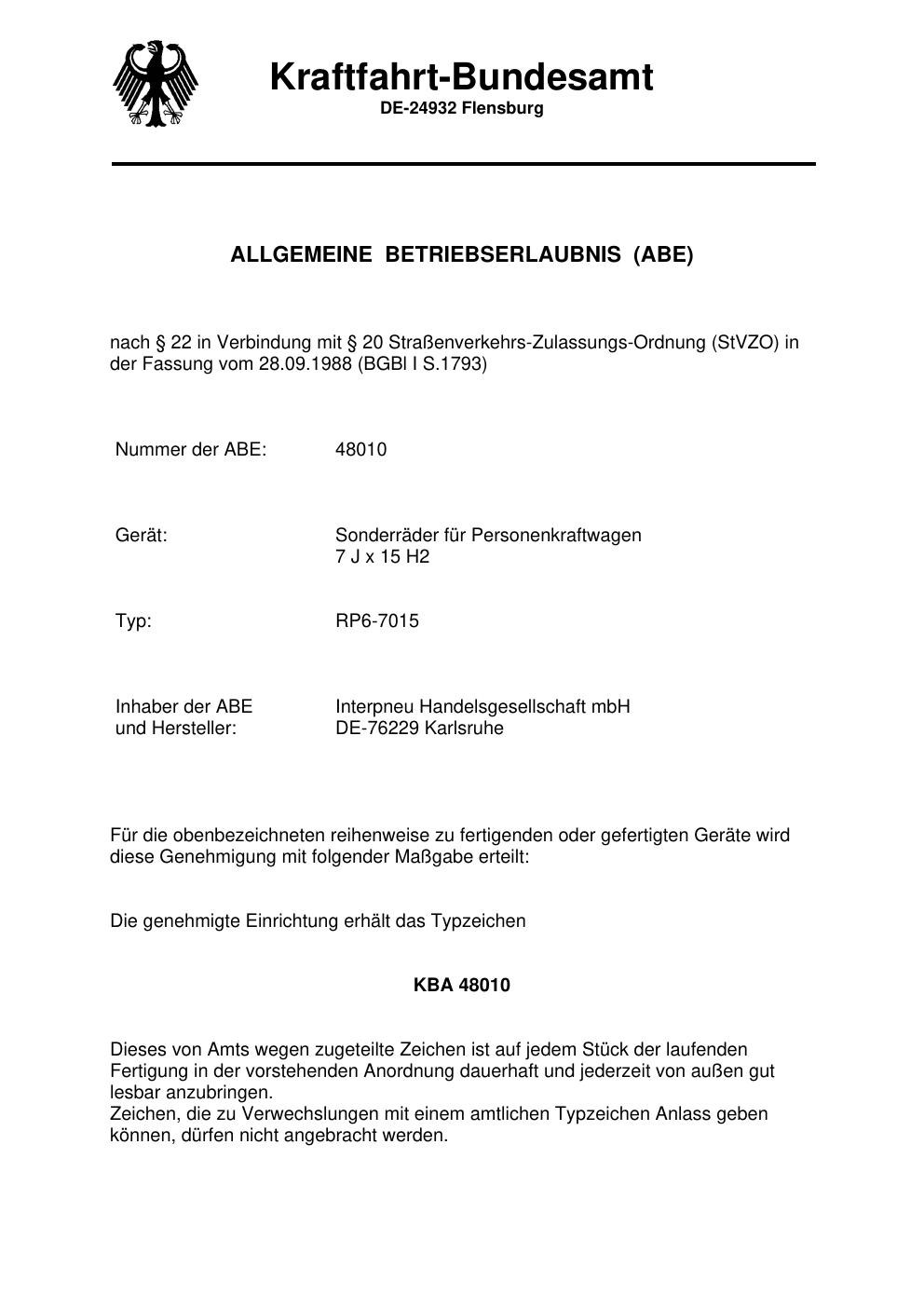 Dieses Gutachten (abe) bezieht sich auf die Alufelge Platin RP6-7015 in der Ausführung 7Jx15 ET 0, Mittenloch 0 mm (KBA 48010). Im PDF findest du typischerweise zulässige Reifengrößen, Auflagen/Anbauhinweise und – je nach Dokument – Hinweise zur Eintragung.