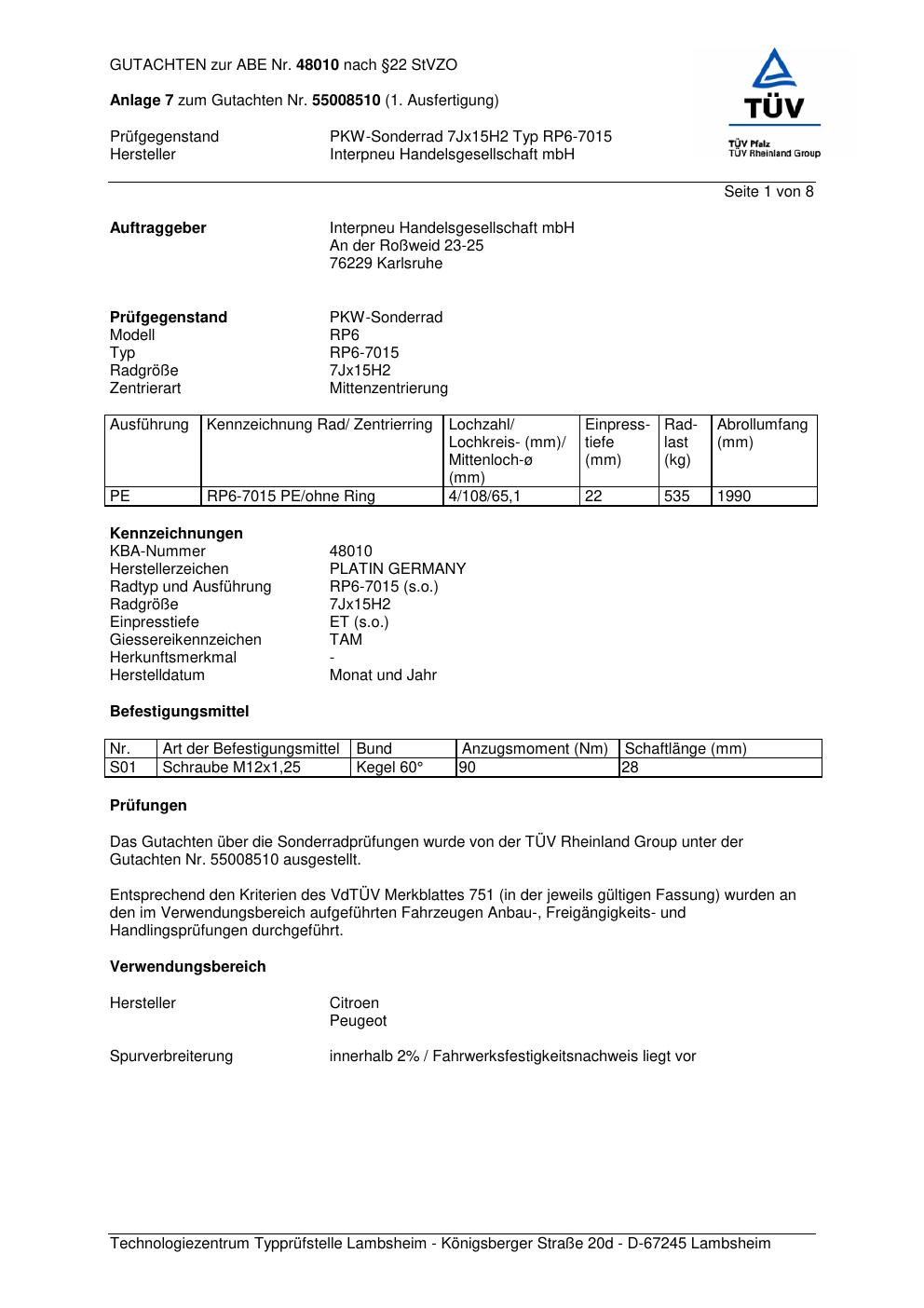 Dieses Gutachten (abe) bezieht sich auf die Alufelge Platin RP6-7015 in der Ausführung 7Jx15 ET 0, Mittenloch 0 mm (KBA 48010). Im PDF findest du typischerweise zulässige Reifengrößen, Auflagen/Anbauhinweise und – je nach Dokument – Hinweise zur Eintragung.