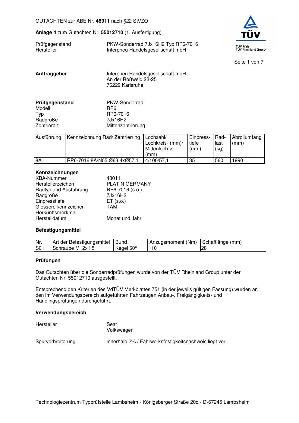 Dieses Gutachten (abe) bezieht sich auf die Alufelge Platin RP6-7016 in der Ausführung 7Jx16 ET 0, Mittenloch 0 mm (KBA 48011). Im PDF findest du typischerweise zulässige Reifengrößen, Auflagen/Anbauhinweise und – je nach Dokument – Hinweise zur Eintragung.