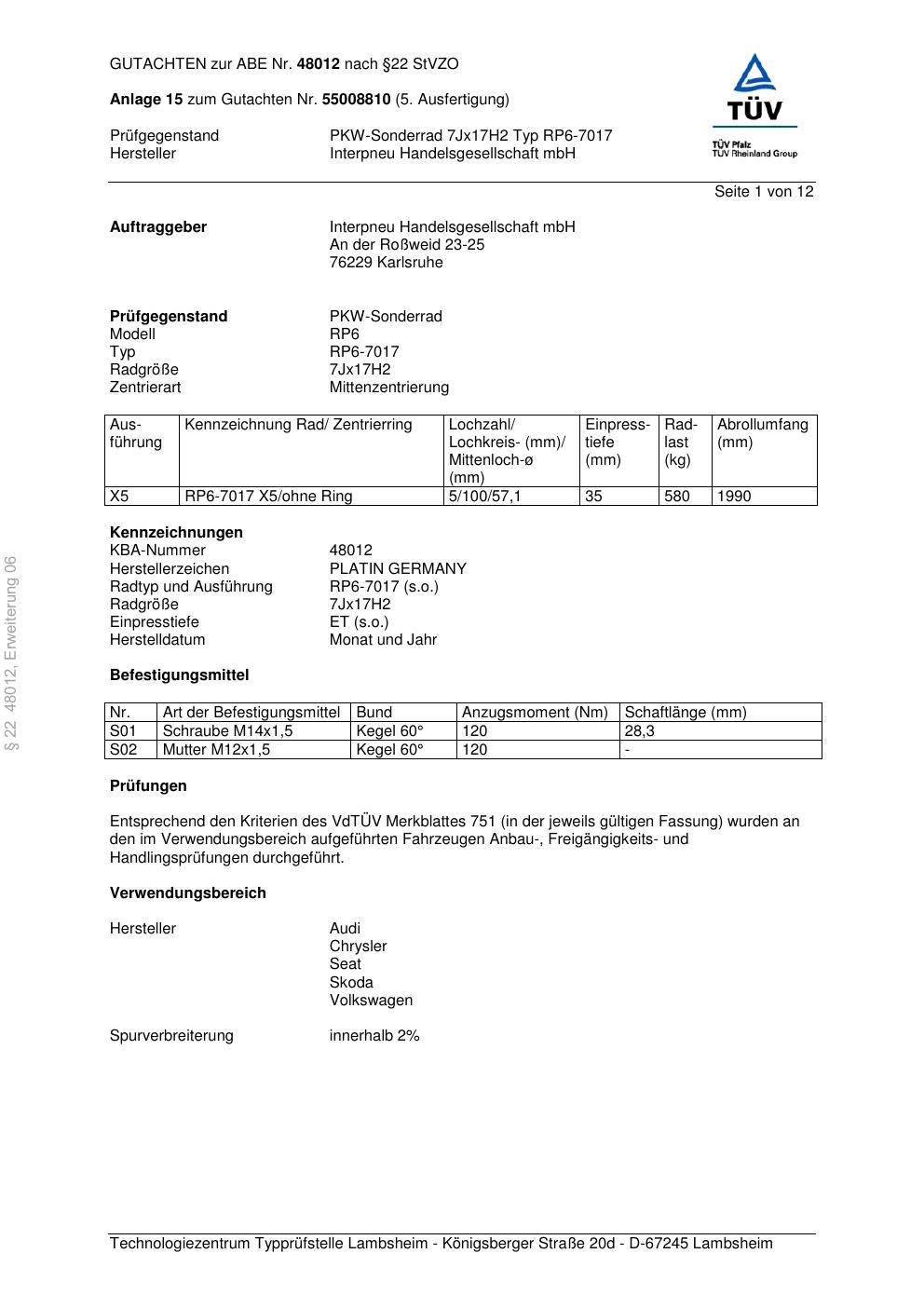 Felgengutachten / abe für Alufelgen Platin RP6-7017 (7Jx17 ET 0, Mittenloch 0 mm) mit KBA 48012 (Zertifikatsnummer 48012). Hier kostenlos als PDF herunterladen. Der Download-Link ist 24 Stunden gültig und kann bis zu zwei Mal verwendet werden.