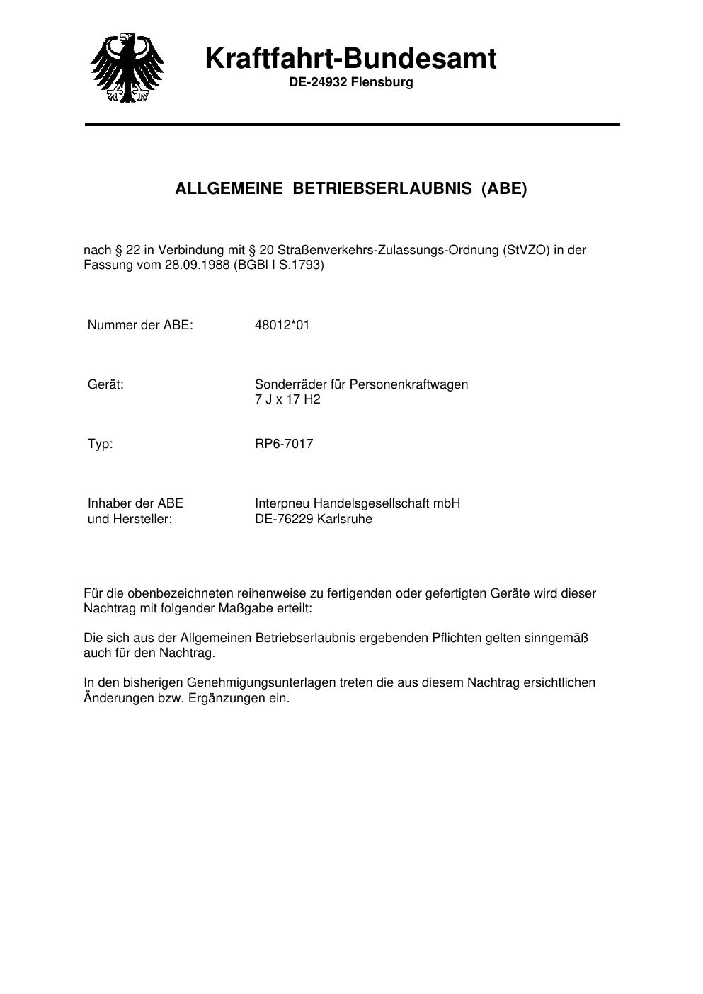 Dieses Gutachten (abe) bezieht sich auf die Alufelge Platin RP6-7017 in der Ausführung 7Jx17 ET 0, Mittenloch 0 mm (KBA 48012). Im PDF findest du typischerweise zulässige Reifengrößen, Auflagen/Anbauhinweise und – je nach Dokument – Hinweise zur Eintragung.