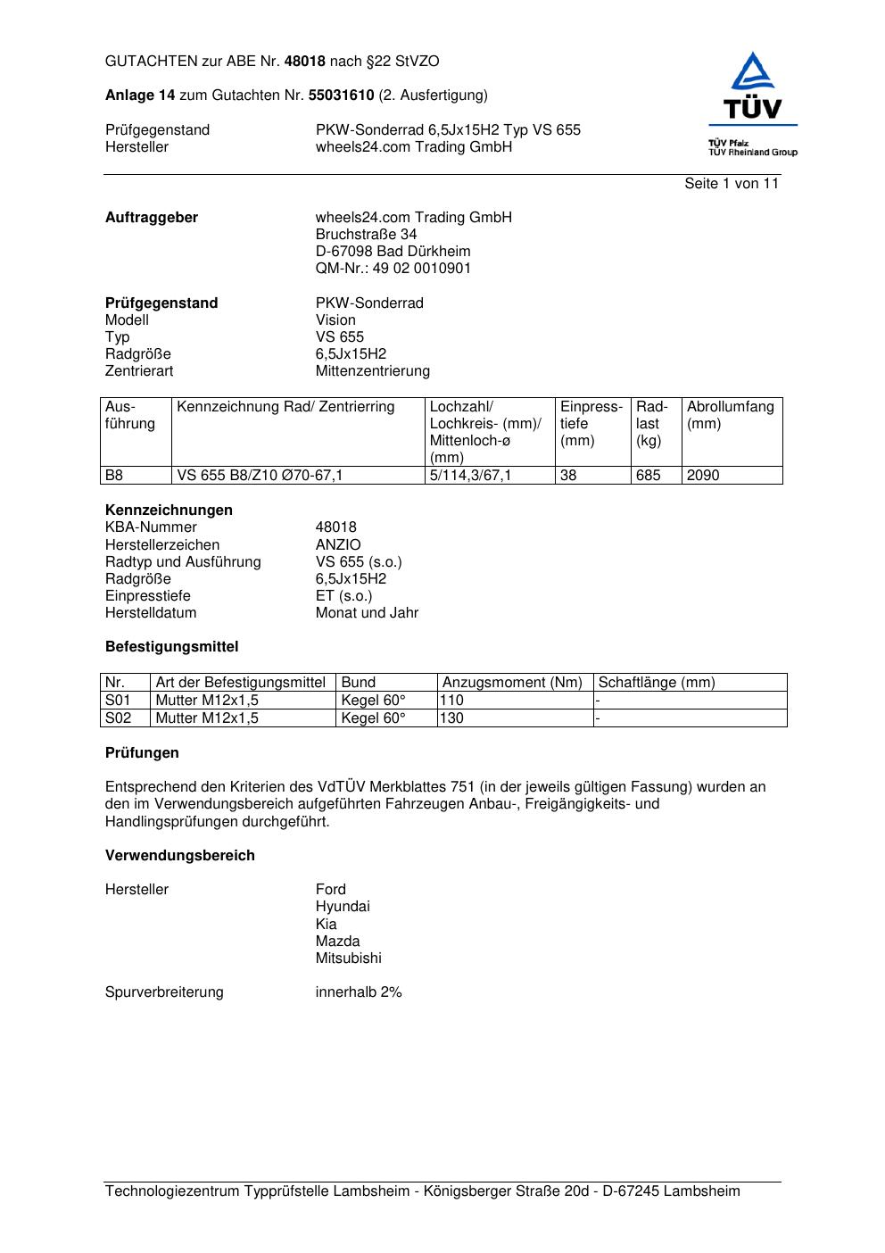 Dieses Gutachten (abe) bezieht sich auf die Alufelge Anzio VS 655 in der Ausführung 6.5Jx15 ET 0, Mittenloch 0 mm (KBA 48018). Im PDF findest du typischerweise zulässige Reifengrößen, Auflagen/Anbauhinweise und – je nach Dokument – Hinweise zur Eintragung.
