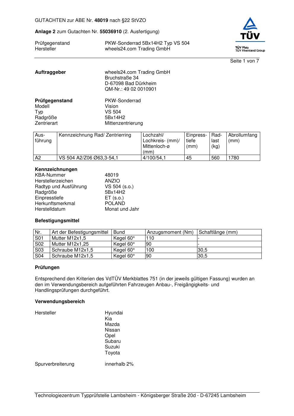 Dieses Gutachten (abe) bezieht sich auf die Alufelge Anzio VS 504 in der Ausführung ET 0, Mittenloch 0 mm (KBA 48019). Im PDF findest du typischerweise zulässige Reifengrößen, Auflagen/Anbauhinweise und – je nach Dokument – Hinweise zur Eintragung.