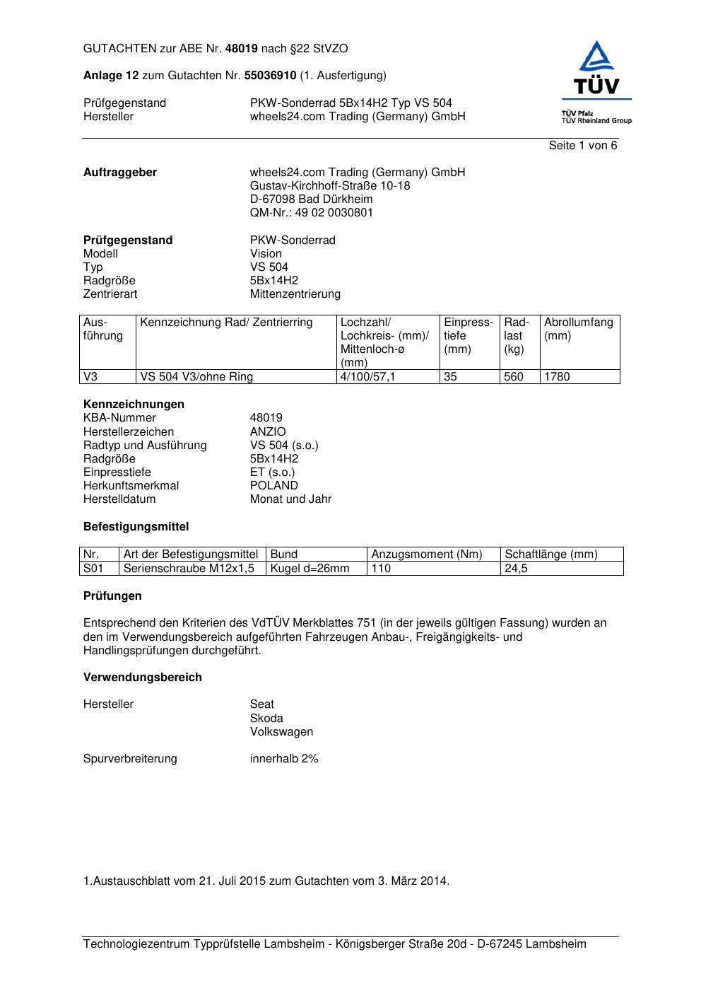 Dieses Gutachten (abe) bezieht sich auf die Alufelge Anzio VS 504 in der Ausführung ET 0, Mittenloch 0 mm (KBA 48019). Im PDF findest du typischerweise zulässige Reifengrößen, Auflagen/Anbauhinweise und – je nach Dokument – Hinweise zur Eintragung.