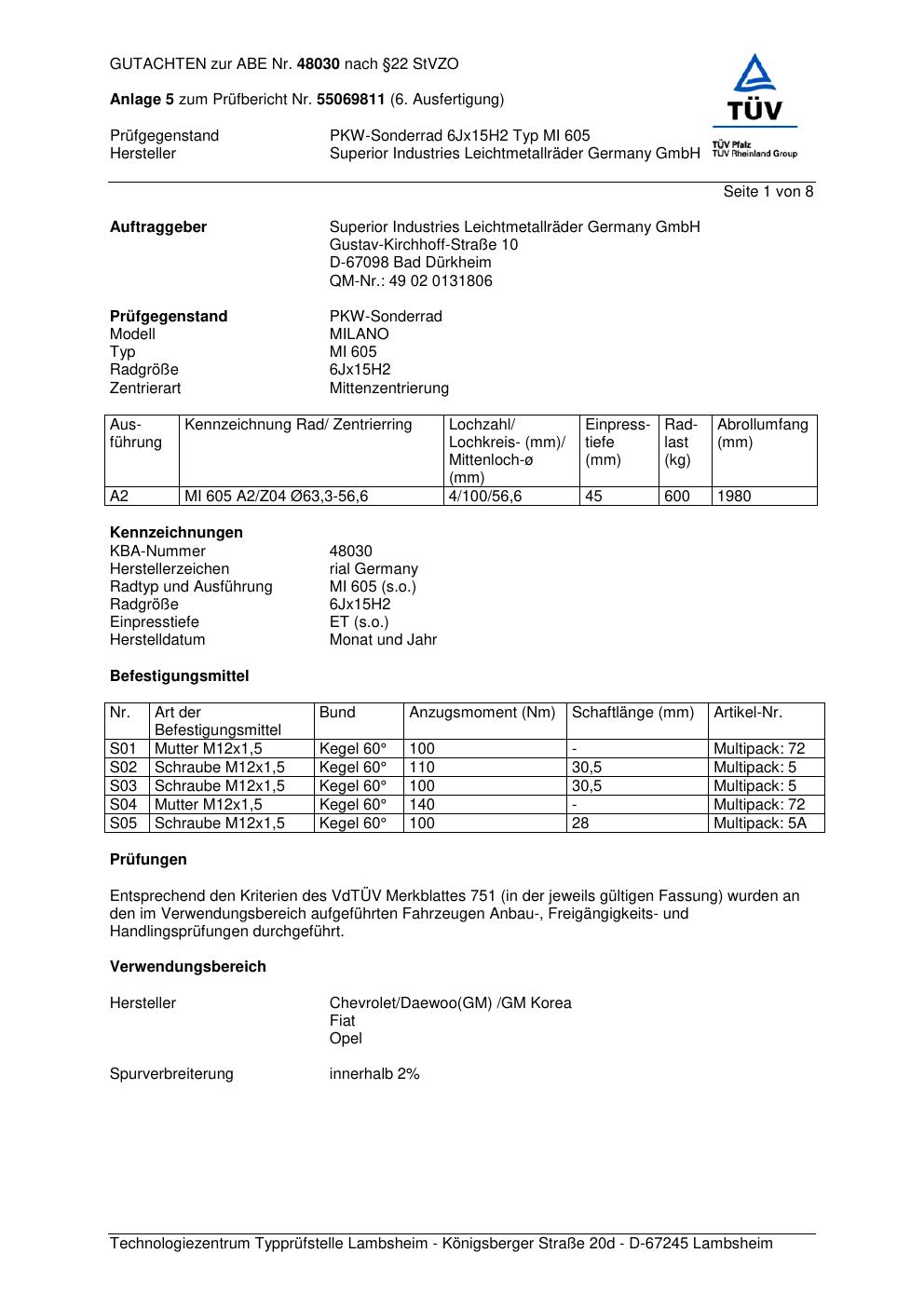 Dieses Gutachten (abe) bezieht sich auf die Alufelge brand-rial MI 605 in der Ausführung 6Jx15 ET 0, Mittenloch 0 mm (KBA 48030). Im PDF findest du typischerweise zulässige Reifengrößen, Auflagen/Anbauhinweise und – je nach Dokument – Hinweise zur Eintragung.