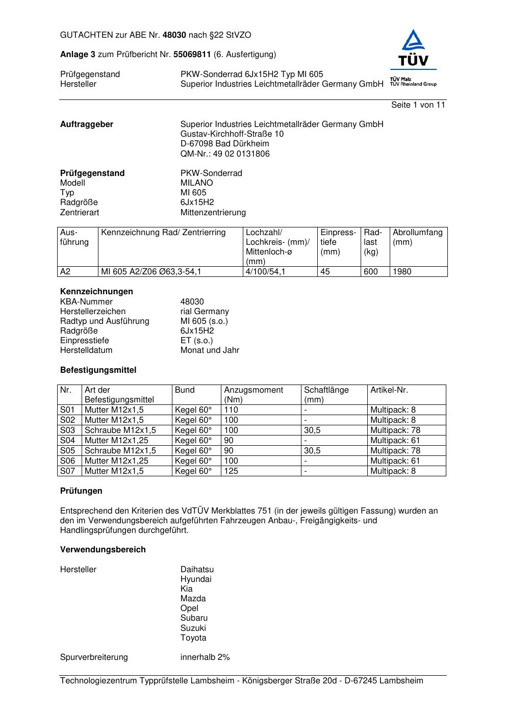 Dieses Gutachten (abe) bezieht sich auf die Alufelge brand-rial MI 605 in der Ausführung 6Jx15 ET 0, Mittenloch 0 mm (KBA 48030). Im PDF findest du typischerweise zulässige Reifengrößen, Auflagen/Anbauhinweise und – je nach Dokument – Hinweise zur Eintragung.