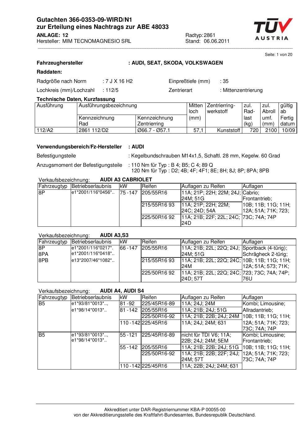 Diese Allgemeine Betriebserlaubnis (ABE) bezieht sich auf die Felge ATS 2861 in der Ausführung 7Jx16 ET0 mit der KBA 48033. Eine ABE ist eine bauartspezifische Genehmigung, die der Hersteller beim Kraftfahrt-Bundesamt (KBA) erwirkt hat. Sie erlaubt die Verwendung der Felge an den im Dokument genannten Fahrzeugen ohne zusätzliche Einzelabnahme, solange sämtliche im Gutachten aufgeführten Auflagen eingehalten werden.