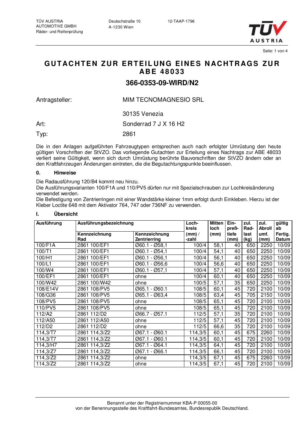 Diese Allgemeine Betriebserlaubnis (ABE) bezieht sich auf die Felge ATS 2861 in der Ausführung 7Jx16 ET0 mit der KBA 48033. Eine ABE ist eine bauartspezifische Genehmigung, die der Hersteller beim Kraftfahrt-Bundesamt (KBA) erwirkt hat. Sie erlaubt die Verwendung der Felge an den im Dokument genannten Fahrzeugen ohne zusätzliche Einzelabnahme, solange sämtliche im Gutachten aufgeführten Auflagen eingehalten werden.