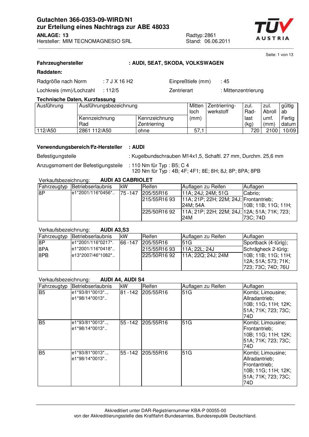 Diese Allgemeine Betriebserlaubnis (ABE) bezieht sich auf die Felge ATS 2861 in der Ausführung 7Jx16 ET0 mit der KBA 48033. Eine ABE ist eine bauartspezifische Genehmigung, die der Hersteller beim Kraftfahrt-Bundesamt (KBA) erwirkt hat. Sie erlaubt die Verwendung der Felge an den im Dokument genannten Fahrzeugen ohne zusätzliche Einzelabnahme, solange sämtliche im Gutachten aufgeführten Auflagen eingehalten werden.