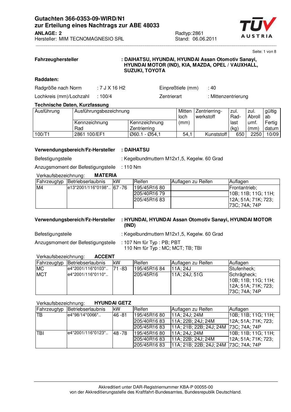 Diese Allgemeine Betriebserlaubnis (ABE) bezieht sich auf die Felge ATS 2861 in der Ausführung 7Jx16 ET0 mit der KBA 48033. Eine ABE ist eine bauartspezifische Genehmigung, die der Hersteller beim Kraftfahrt-Bundesamt (KBA) erwirkt hat. Sie erlaubt die Verwendung der Felge an den im Dokument genannten Fahrzeugen ohne zusätzliche Einzelabnahme, solange sämtliche im Gutachten aufgeführten Auflagen eingehalten werden.