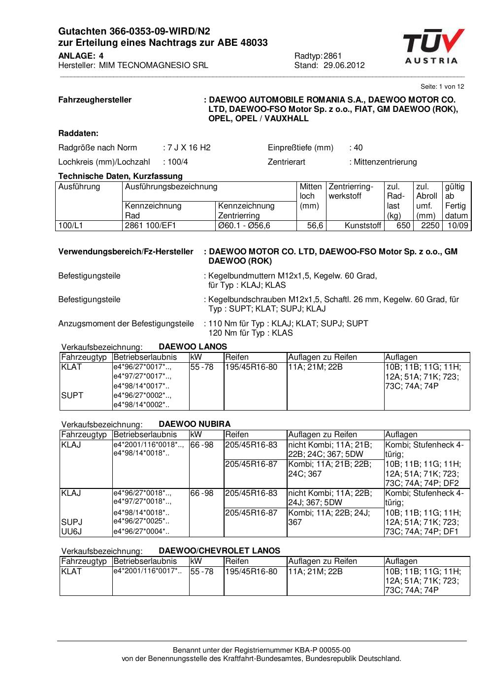 Dieses abe führt 5 Fahrzeugvarianten von 5 Fahrzeugherstellern als zulässig auf. Abgedeckt werden insbesondere Fahrzeuge von CHEVROLET, DAEWOO, FIAT, OPEL, VAUXHALL. Prüfe in der folgenden Liste, ob dein konkretes Fahrzeugmodell und – soweit angegeben – der passende Typ-Code (HSN/TSN-Variante) dabei ist. Der Typ-Code steht im Fahrzeugschein unter den Ziffern 2.1 und 2.2.