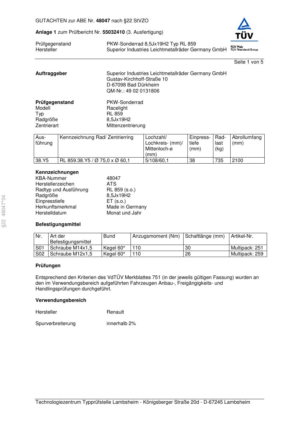 Dieses Gutachten (abe) bezieht sich auf die Alufelge ATS RL 859 in der Ausführung 8.5Jx19 ET 0, Mittenloch 0 mm (KBA 48047). Im PDF findest du typischerweise zulässige Reifengrößen, Auflagen/Anbauhinweise und – je nach Dokument – Hinweise zur Eintragung.