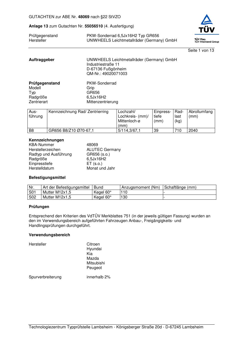 Dieses Gutachten (abe) bezieht sich auf die Alufelge ALUTEC GR656 in der Ausführung 6.5Jx16 ET 0, Mittenloch 0 mm (KBA 48069). Im PDF findest du typischerweise zulässige Reifengrößen, Auflagen/Anbauhinweise und – je nach Dokument – Hinweise zur Eintragung.