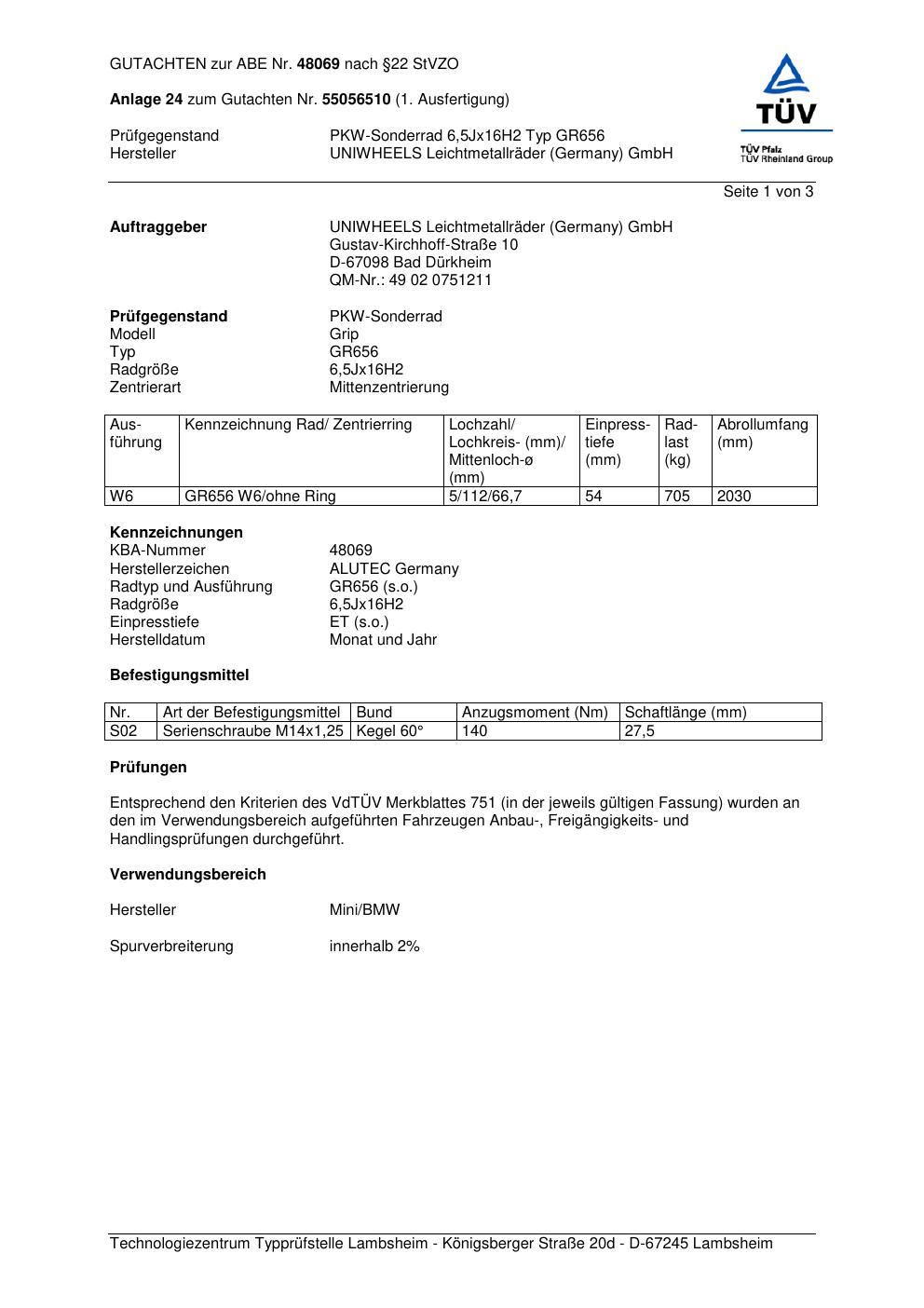 Dieses Gutachten (abe) bezieht sich auf die Alufelge ALUTEC GR656 in der Ausführung 6.5Jx16 ET 0, Mittenloch 0 mm (KBA 48069). Im PDF findest du typischerweise zulässige Reifengrößen, Auflagen/Anbauhinweise und – je nach Dokument – Hinweise zur Eintragung.