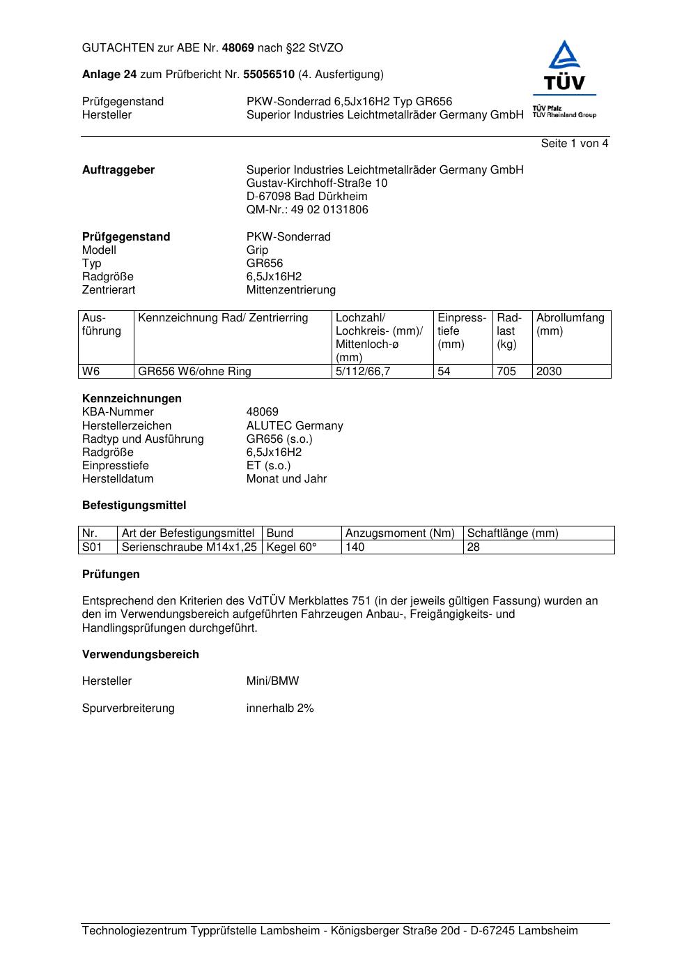 Dieses Gutachten (abe) bezieht sich auf die Alufelge ALUTEC GR656 in der Ausführung 6.5Jx16 ET 0, Mittenloch 0 mm (KBA 48069). Im PDF findest du typischerweise zulässige Reifengrößen, Auflagen/Anbauhinweise und – je nach Dokument – Hinweise zur Eintragung.