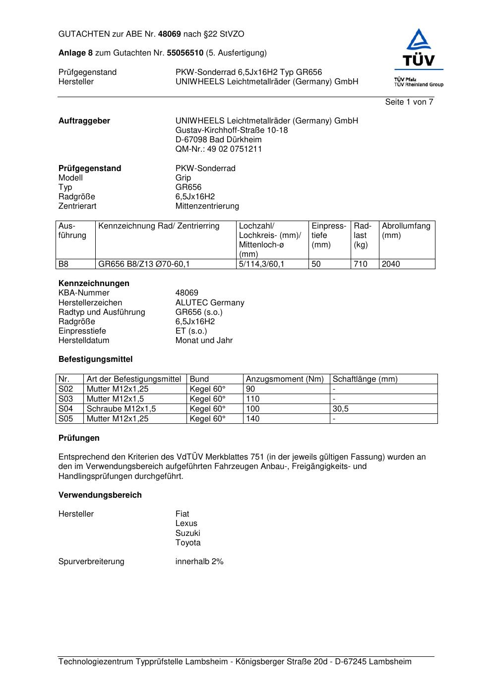Dieses Gutachten (abe) bezieht sich auf die Alufelge ALUTEC GR656 in der Ausführung 6.5Jx16 ET 0, Mittenloch 0 mm (KBA 48069). Im PDF findest du typischerweise zulässige Reifengrößen, Auflagen/Anbauhinweise und – je nach Dokument – Hinweise zur Eintragung.