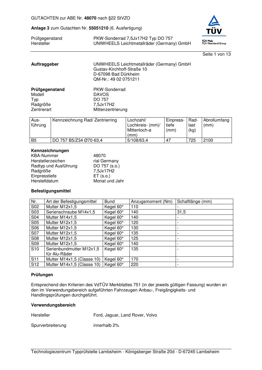Dieses Gutachten (abe) bezieht sich auf die Alufelge brand-rial DO 757 in der Ausführung 7.5Jx17 ET 0, Mittenloch 0 mm (KBA 48070). Im PDF findest du typischerweise zulässige Reifengrößen, Auflagen/Anbauhinweise und – je nach Dokument – Hinweise zur Eintragung.