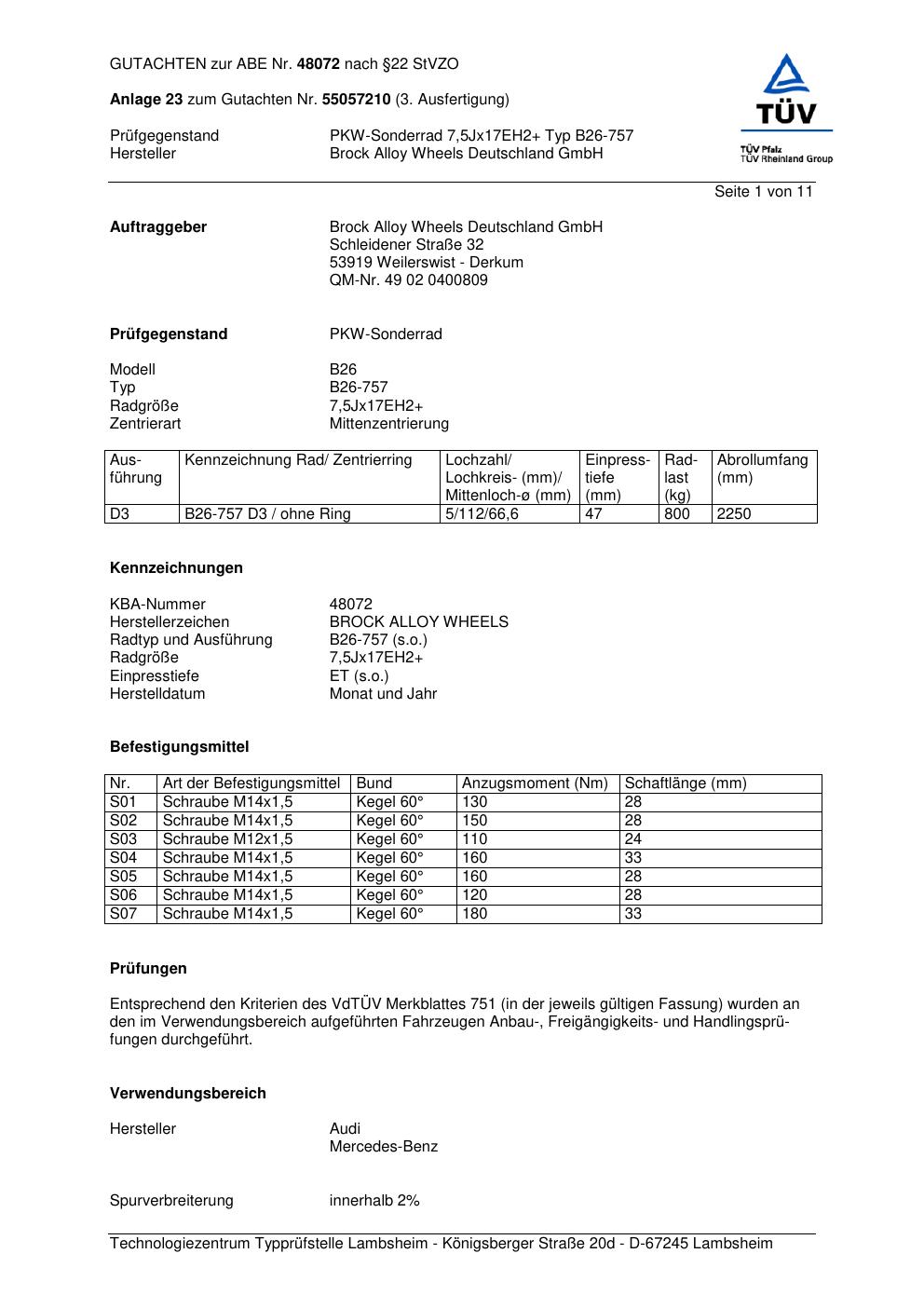 Dieses Gutachten (abe) bezieht sich auf die Alufelge Brock B26-75 7 in der Ausführung ET 0, Mittenloch 0 mm (KBA 48072). Im PDF findest du typischerweise zulässige Reifengrößen, Auflagen/Anbauhinweise und – je nach Dokument – Hinweise zur Eintragung.