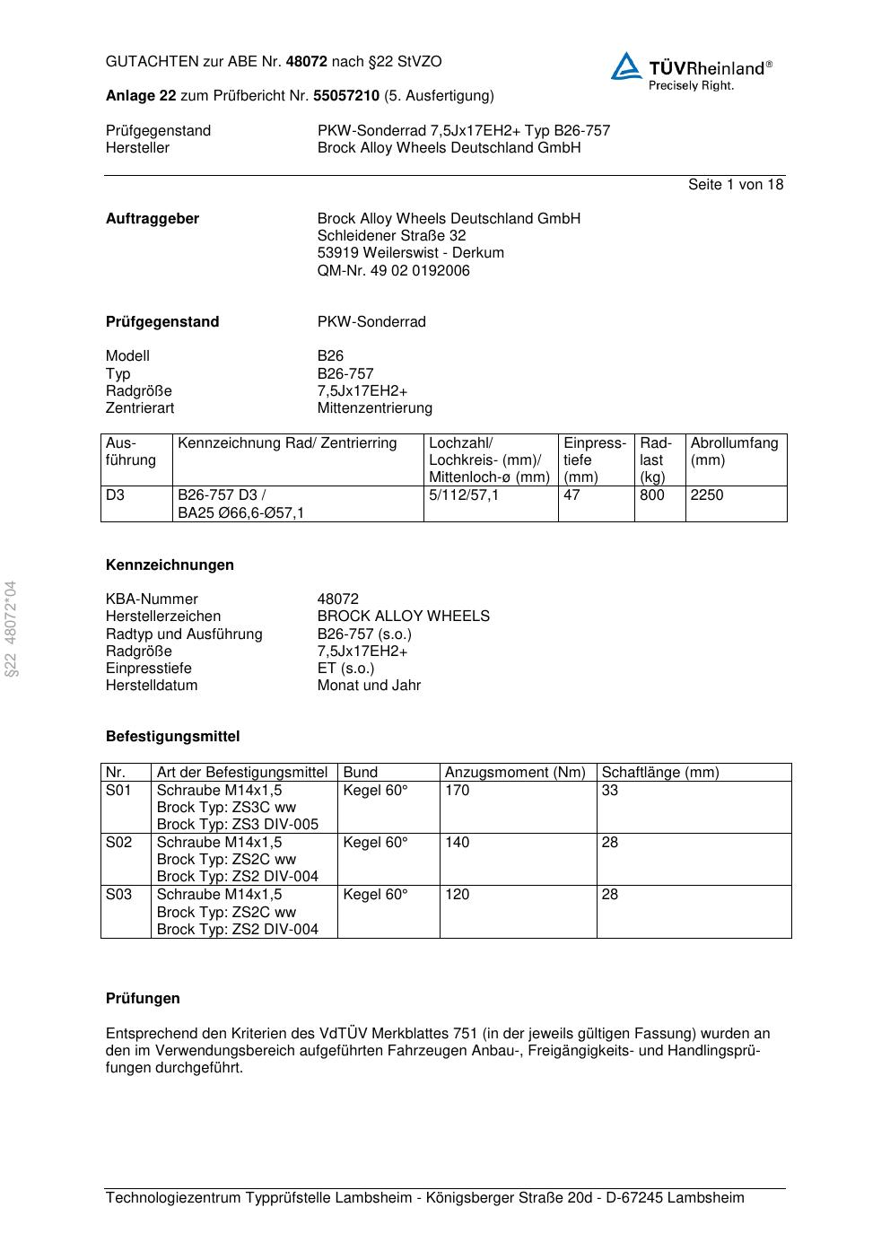 Felgengutachten / abe für Alufelgen Brock B26-75 7 (70Jx2 ET 0, Mittenloch 0 mm) mit KBA 48072 (Zertifikatsnummer 48072). Hier kostenlos als PDF herunterladen. Der Download-Link ist 24 Stunden gültig und kann bis zu zwei Mal verwendet werden.