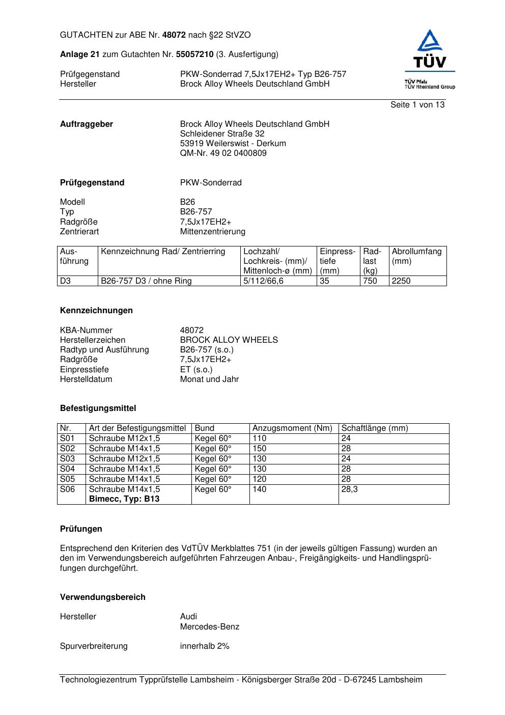 Dieses Gutachten (abe) bezieht sich auf die Alufelge Brock B26-75 7 in der Ausführung ET 0, Mittenloch 0 mm (KBA 48072). Im PDF findest du typischerweise zulässige Reifengrößen, Auflagen/Anbauhinweise und – je nach Dokument – Hinweise zur Eintragung.