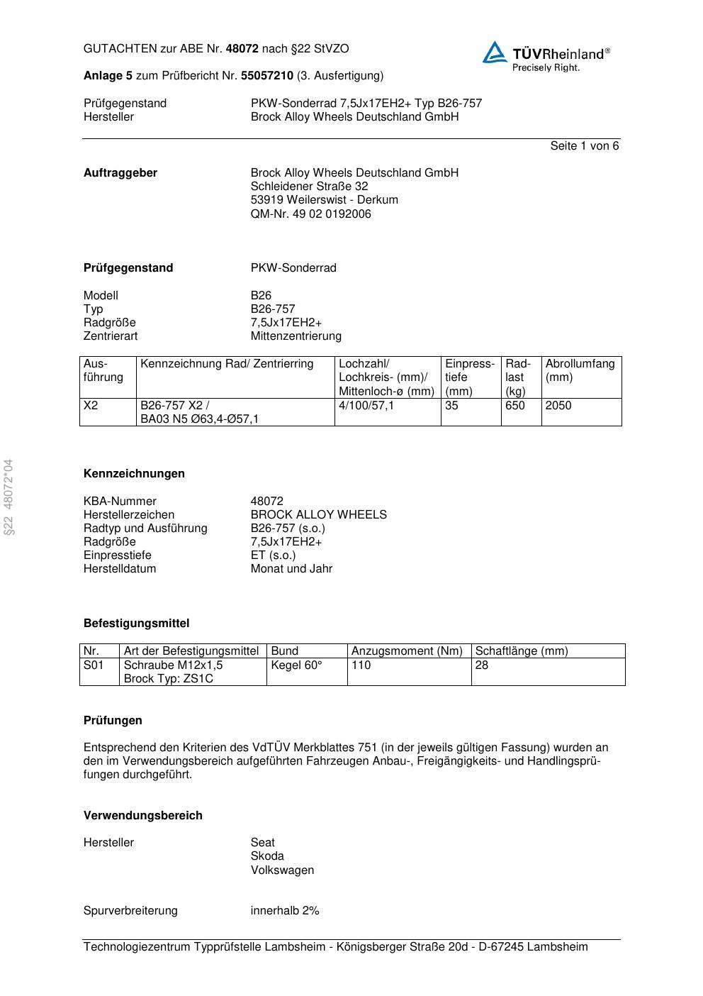 Dieses Gutachten (abe) bezieht sich auf die Alufelge Brock B26-75 7 in der Ausführung ET 0, Mittenloch 0 mm (KBA 48072). Im PDF findest du typischerweise zulässige Reifengrößen, Auflagen/Anbauhinweise und – je nach Dokument – Hinweise zur Eintragung.