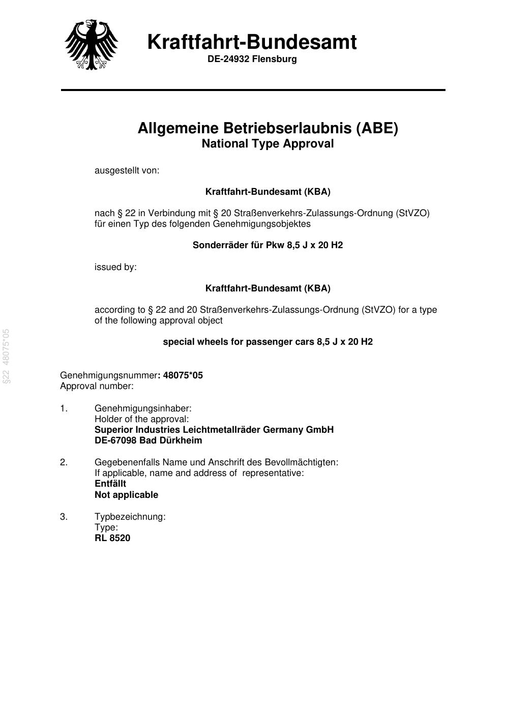 Felgengutachten / abe für Alufelgen ATS PSN 9521 (8.5Jx2 ET 0, Mittenloch 0 mm) mit KBA 48075 (Zertifikatsnummer 48075). Hier kostenlos als PDF herunterladen. Der Download-Link ist 24 Stunden gültig und kann bis zu zwei Mal verwendet werden.