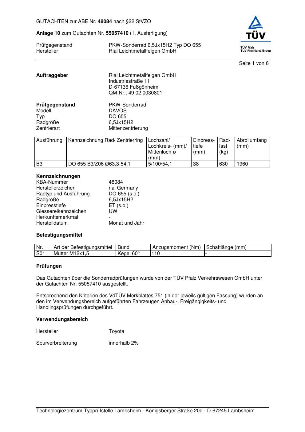 Dieses Gutachten (abe) bezieht sich auf die Alufelge brand-rial DO 655 in der Ausführung 6.5Jx15 ET 0, Mittenloch 0 mm (KBA 48084). Im PDF findest du typischerweise zulässige Reifengrößen, Auflagen/Anbauhinweise und – je nach Dokument – Hinweise zur Eintragung.