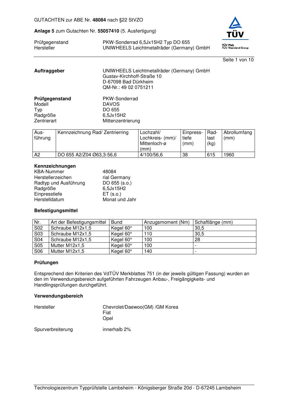 Dieses Gutachten (abe) bezieht sich auf die Alufelge brand-rial DO 655 in der Ausführung 6.5Jx15 ET 0, Mittenloch 0 mm (KBA 48084). Im PDF findest du typischerweise zulässige Reifengrößen, Auflagen/Anbauhinweise und – je nach Dokument – Hinweise zur Eintragung.