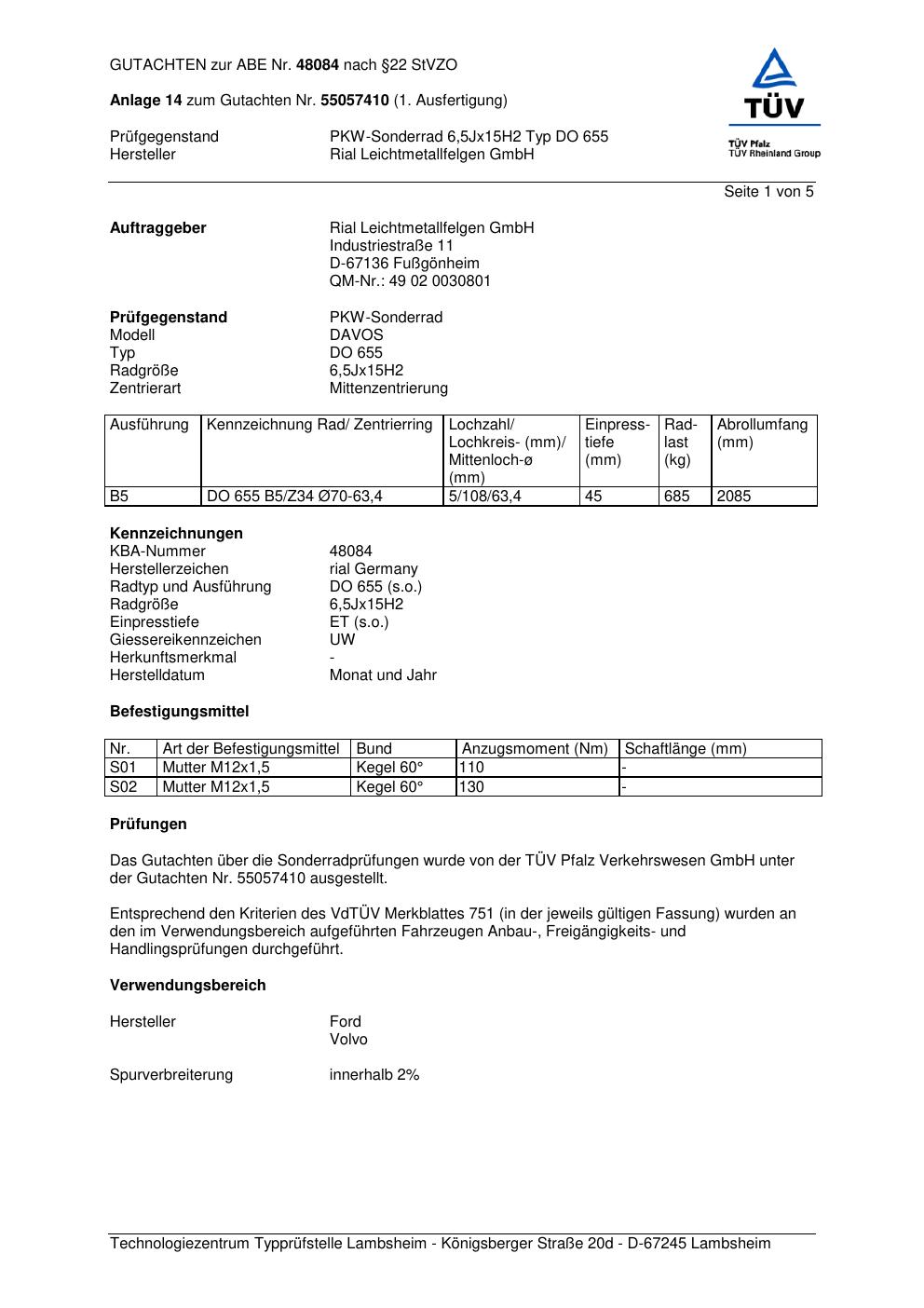 Dieses Gutachten (abe) bezieht sich auf die Alufelge brand-rial DO 655 in der Ausführung 6.5Jx15 ET 0, Mittenloch 0 mm (KBA 48084). Im PDF findest du typischerweise zulässige Reifengrößen, Auflagen/Anbauhinweise und – je nach Dokument – Hinweise zur Eintragung.