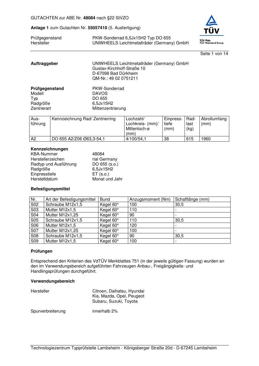 Dieses Gutachten (abe) bezieht sich auf die Alufelge brand-rial DO 655 in der Ausführung 6.5Jx15 ET 0, Mittenloch 0 mm (KBA 48084). Im PDF findest du typischerweise zulässige Reifengrößen, Auflagen/Anbauhinweise und – je nach Dokument – Hinweise zur Eintragung.