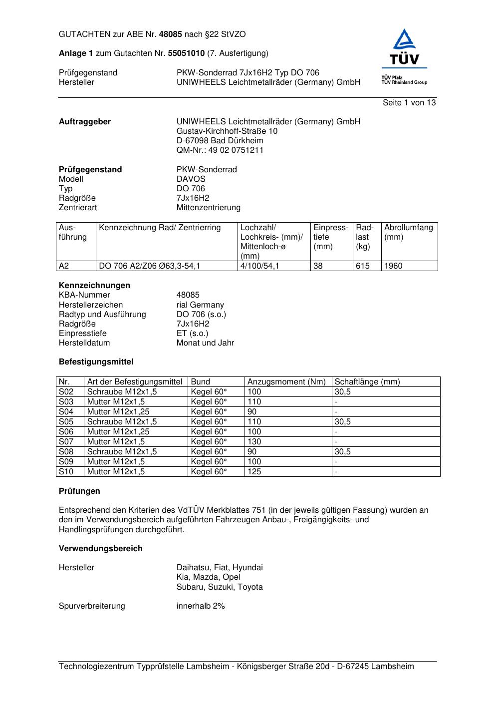 Dieses Gutachten (abe) bezieht sich auf die Alufelge brand-rial DO 706 in der Ausführung 7Jx16 ET 0, Mittenloch 0 mm (KBA 48085). Im PDF findest du typischerweise zulässige Reifengrößen, Auflagen/Anbauhinweise und – je nach Dokument – Hinweise zur Eintragung.