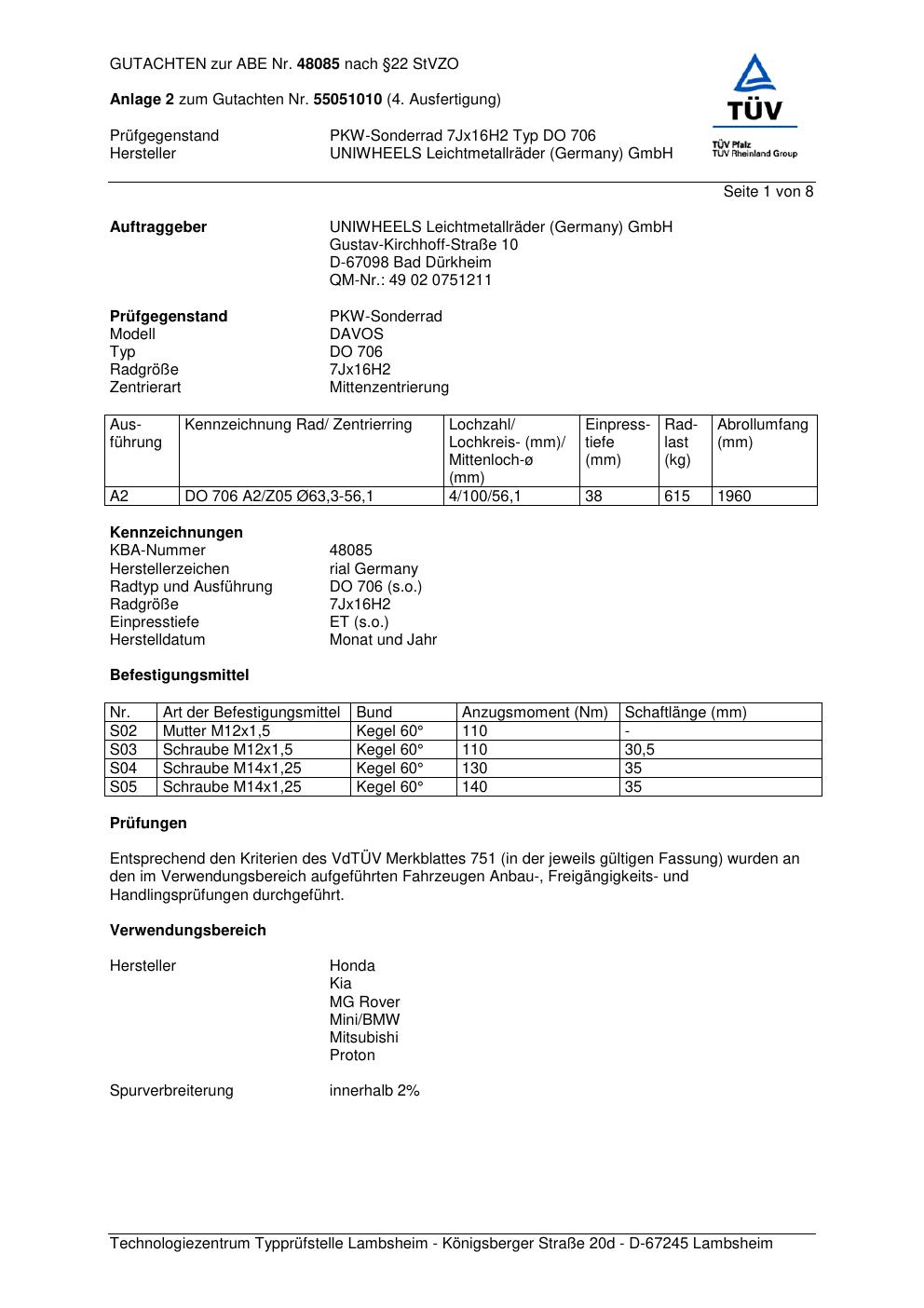 Dieses Gutachten (abe) bezieht sich auf die Alufelge brand-rial DO 706 in der Ausführung 7Jx16 ET 0, Mittenloch 0 mm (KBA 48085). Im PDF findest du typischerweise zulässige Reifengrößen, Auflagen/Anbauhinweise und – je nach Dokument – Hinweise zur Eintragung.
