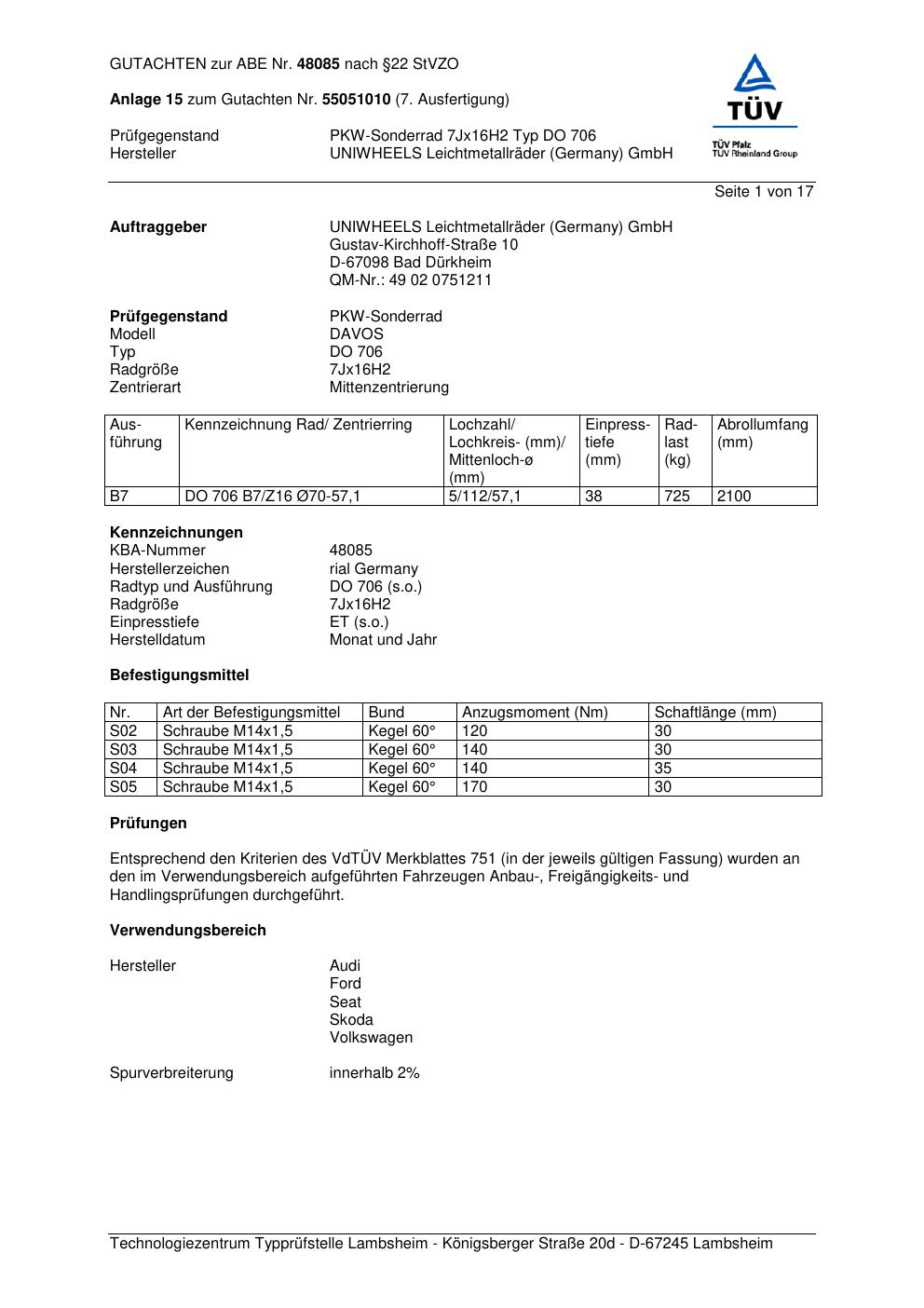 Dieses Gutachten (abe) bezieht sich auf die Alufelge brand-rial DO 706 in der Ausführung 7Jx16 ET 0, Mittenloch 0 mm (KBA 48085). Im PDF findest du typischerweise zulässige Reifengrößen, Auflagen/Anbauhinweise und – je nach Dokument – Hinweise zur Eintragung.