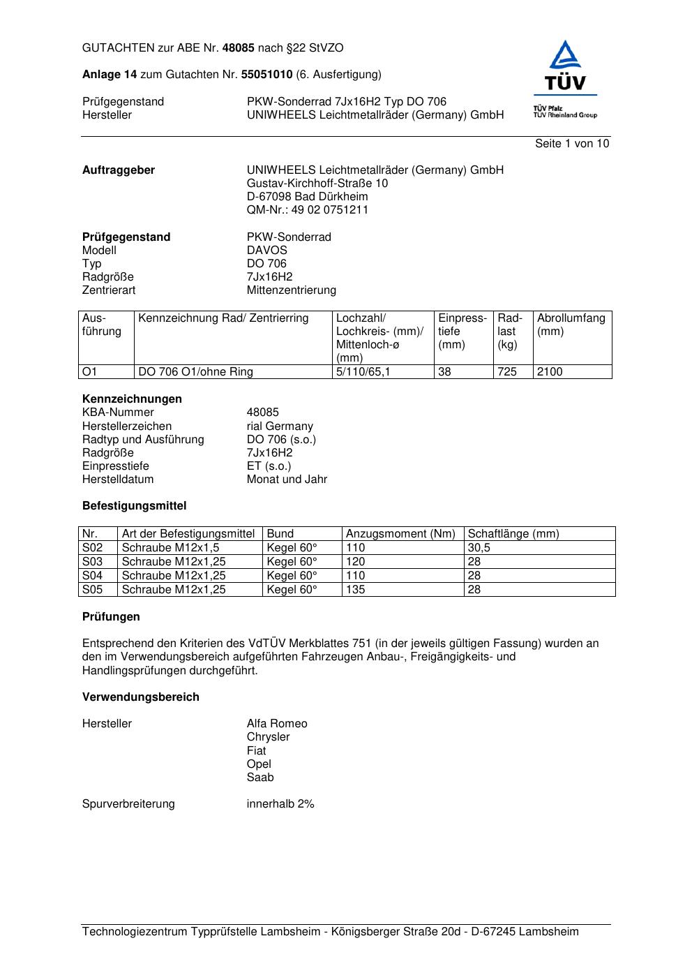 Dieses Gutachten (abe) bezieht sich auf die Alufelge brand-rial DO 706 in der Ausführung 7Jx16 ET 0, Mittenloch 0 mm (KBA 48085). Im PDF findest du typischerweise zulässige Reifengrößen, Auflagen/Anbauhinweise und – je nach Dokument – Hinweise zur Eintragung.