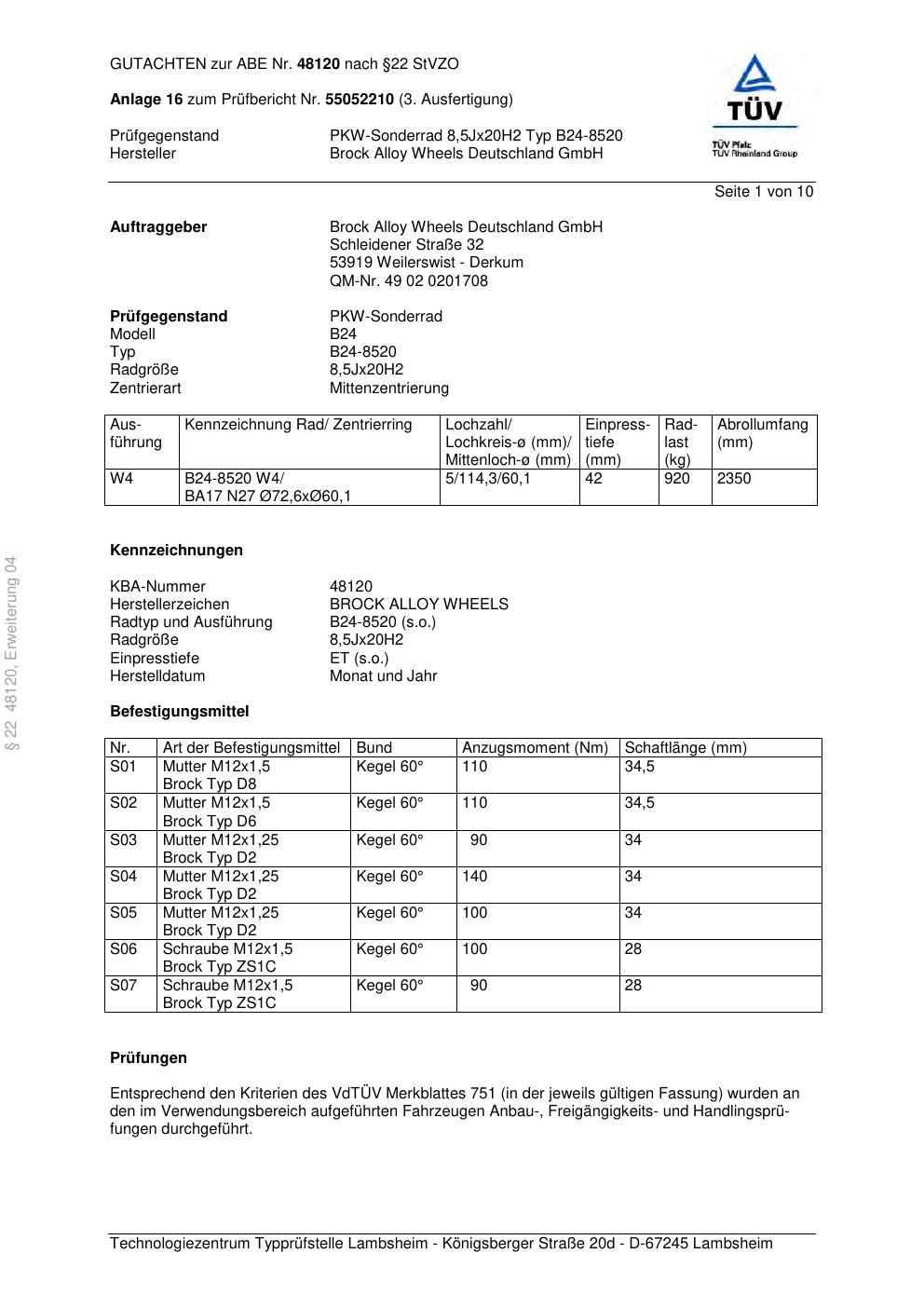 Dieses Gutachten (abe) bezieht sich auf die Alufelge Brock B24-8520 in der Ausführung 8.5Jx2 ET 0, Mittenloch 0 mm (KBA 48120). Im PDF findest du typischerweise zulässige Reifengrößen, Auflagen/Anbauhinweise und – je nach Dokument – Hinweise zur Eintragung.