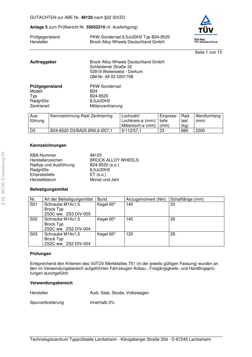 Dieses Gutachten (abe) bezieht sich auf die Alufelge Brock B24-8520 in der Ausführung 8.5Jx2 ET 0, Mittenloch 0 mm (KBA 48120). Im PDF findest du typischerweise zulässige Reifengrößen, Auflagen/Anbauhinweise und – je nach Dokument – Hinweise zur Eintragung.
