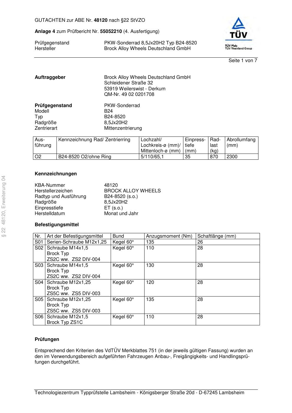 Dieses Gutachten (abe) bezieht sich auf die Alufelge Brock B24-8520 in der Ausführung 8.5Jx2 ET 0, Mittenloch 0 mm (KBA 48120). Im PDF findest du typischerweise zulässige Reifengrößen, Auflagen/Anbauhinweise und – je nach Dokument – Hinweise zur Eintragung.