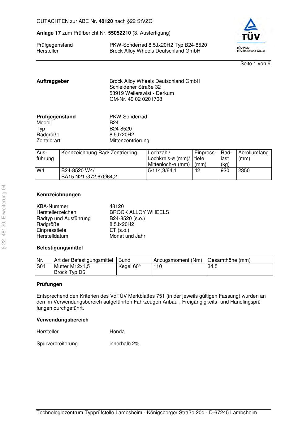 Dieses Gutachten (abe) bezieht sich auf die Alufelge Brock B24-8520 in der Ausführung 8.5Jx2 ET 0, Mittenloch 0 mm (KBA 48120). Im PDF findest du typischerweise zulässige Reifengrößen, Auflagen/Anbauhinweise und – je nach Dokument – Hinweise zur Eintragung.