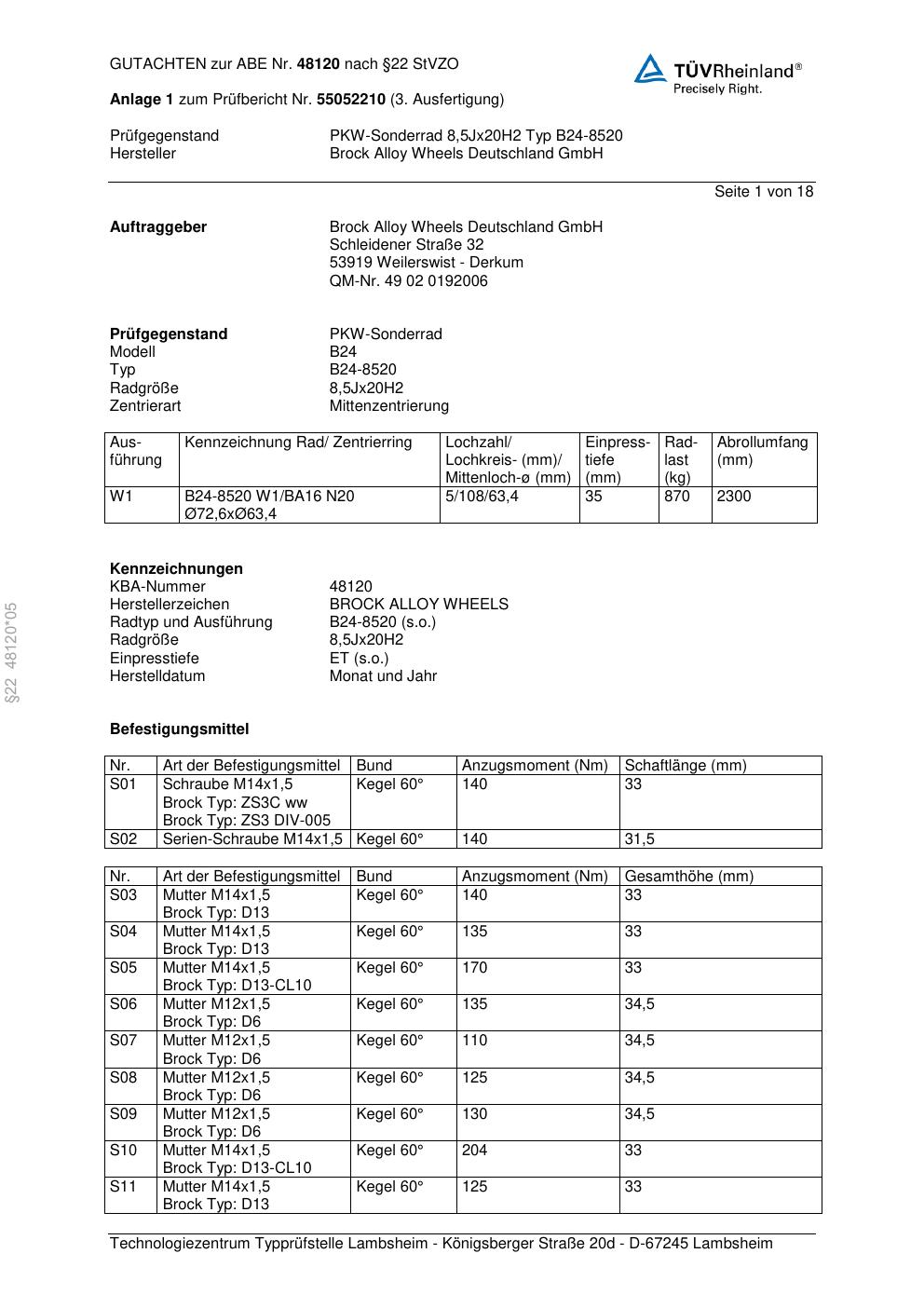 Dieses Gutachten (abe) bezieht sich auf die Alufelge Brock B24-8520 in der Ausführung 8.5Jx2 ET 0, Mittenloch 0 mm (KBA 48120). Im PDF findest du typischerweise zulässige Reifengrößen, Auflagen/Anbauhinweise und – je nach Dokument – Hinweise zur Eintragung.