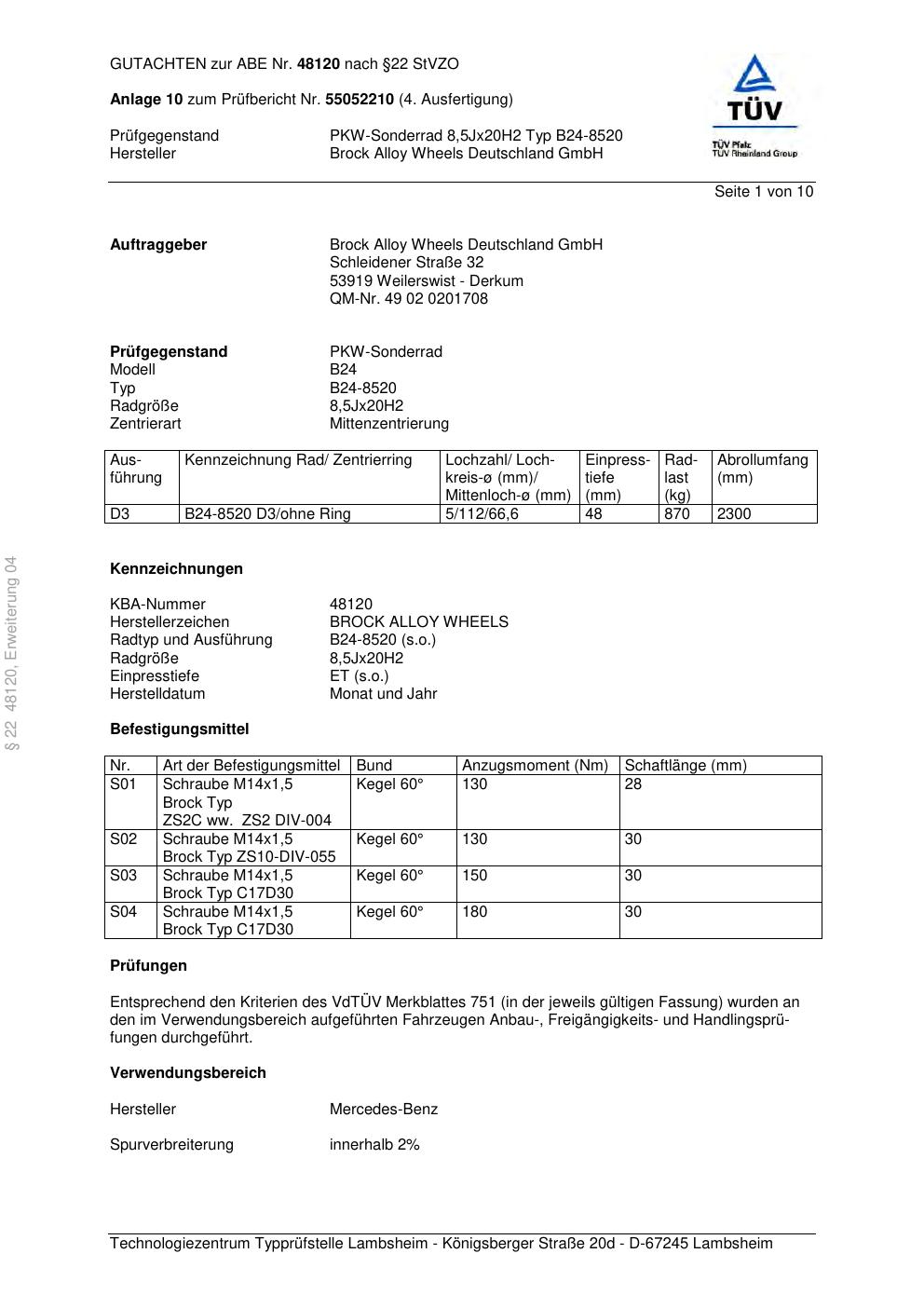 Dieses Gutachten (abe) bezieht sich auf die Alufelge Brock B24-8520 in der Ausführung 8.5Jx2 ET 0, Mittenloch 0 mm (KBA 48120). Im PDF findest du typischerweise zulässige Reifengrößen, Auflagen/Anbauhinweise und – je nach Dokument – Hinweise zur Eintragung.