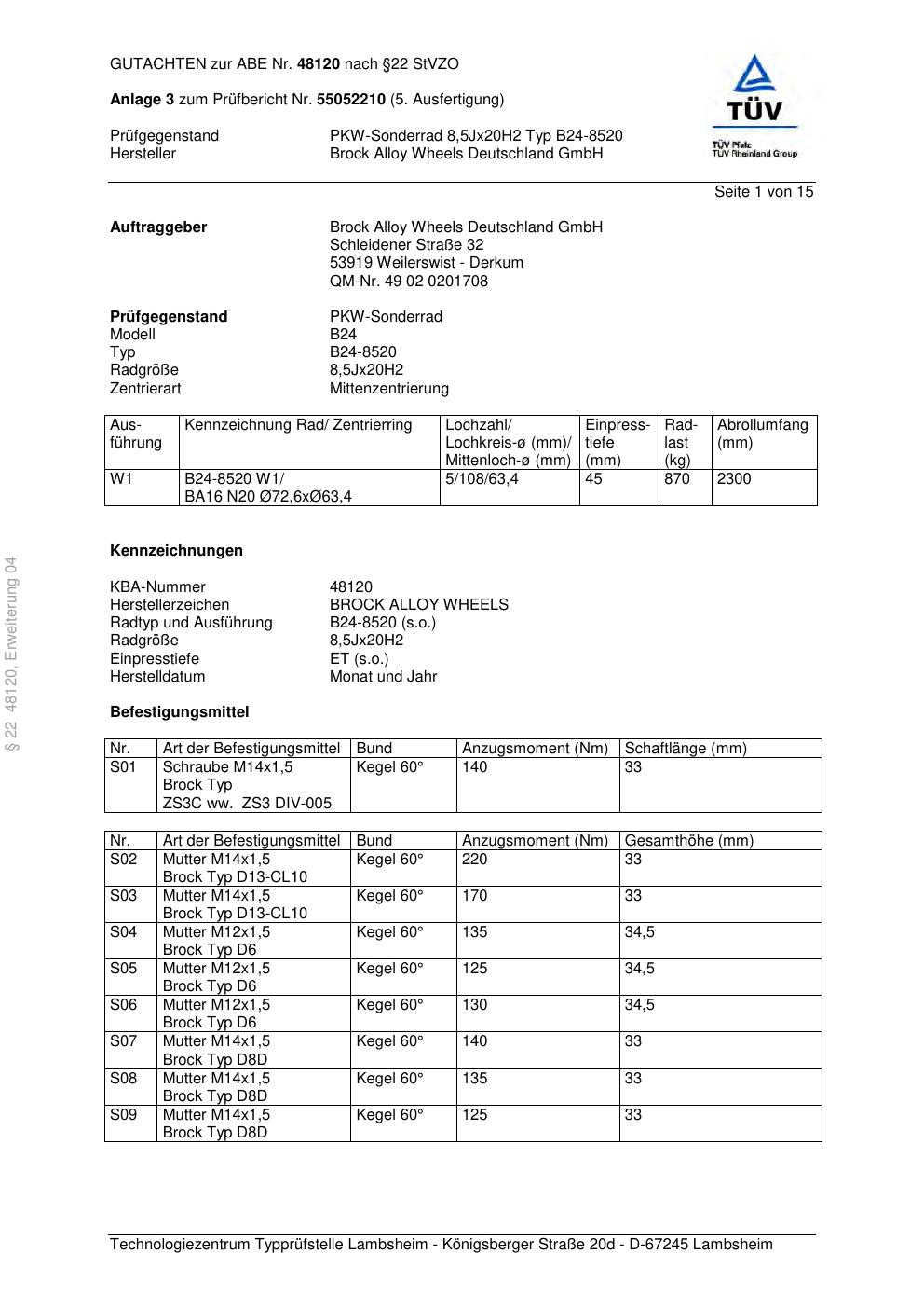 Dieses Gutachten (abe) bezieht sich auf die Alufelge Brock B24-8520 in der Ausführung 8.5Jx2 ET 0, Mittenloch 0 mm (KBA 48120). Im PDF findest du typischerweise zulässige Reifengrößen, Auflagen/Anbauhinweise und – je nach Dokument – Hinweise zur Eintragung.