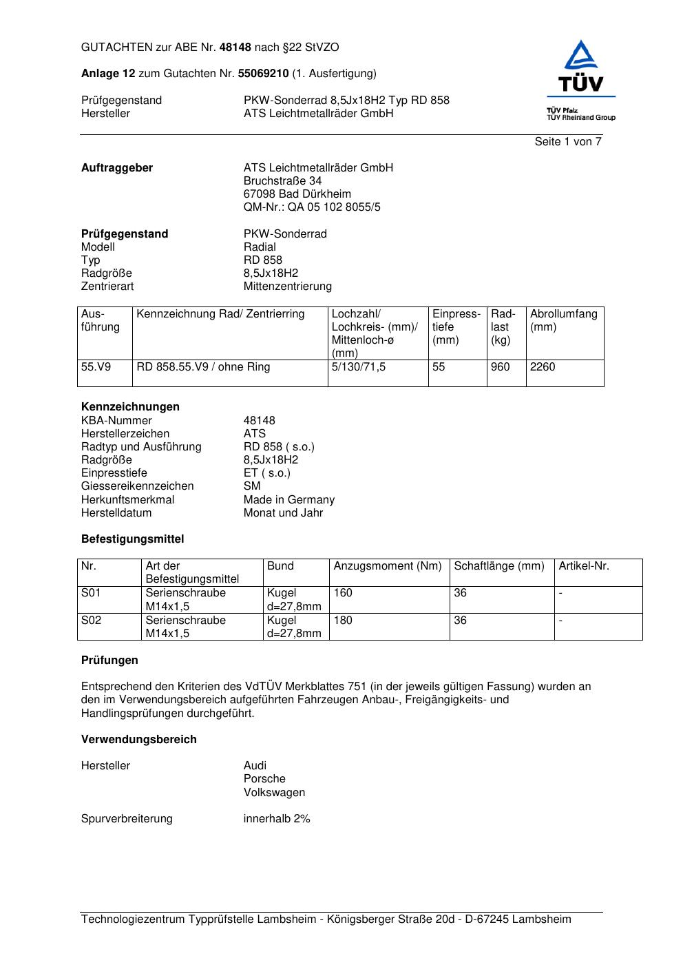 Dieses Gutachten (abe) bezieht sich auf die Alufelge ATS RD 858 in der Ausführung 8.5Jx18 ET 0, Mittenloch 0 mm (KBA 48148). Im PDF findest du typischerweise zulässige Reifengrößen, Auflagen/Anbauhinweise und – je nach Dokument – Hinweise zur Eintragung.