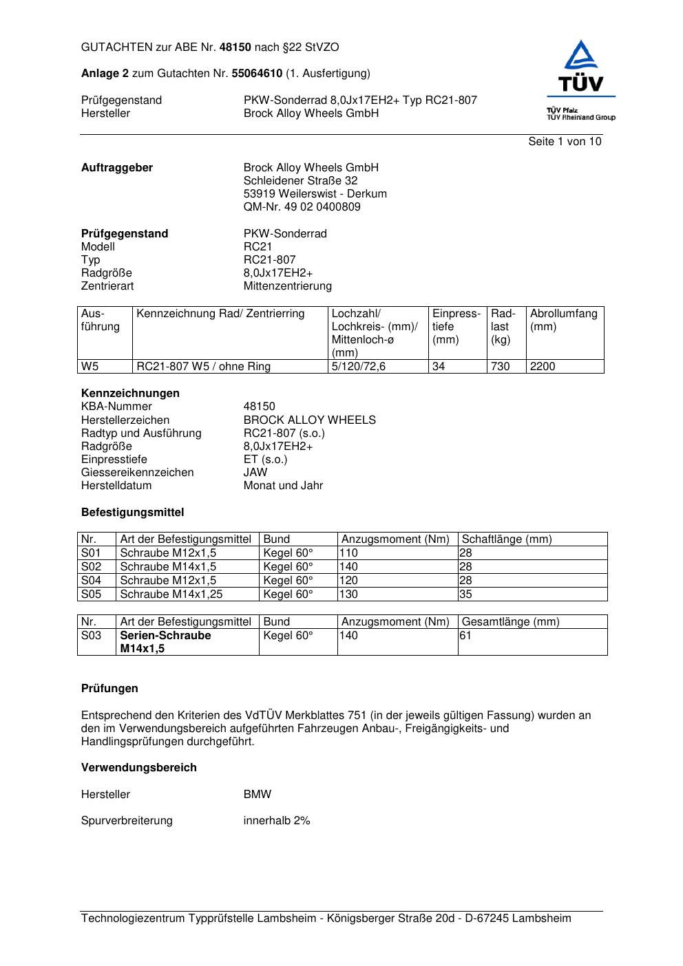 Dieses Gutachten (abe) bezieht sich auf die Alufelge Brock RC21-8 07 in der Ausführung ET 0, Mittenloch 0 mm (KBA 48150). Im PDF findest du typischerweise zulässige Reifengrößen, Auflagen/Anbauhinweise und – je nach Dokument – Hinweise zur Eintragung.