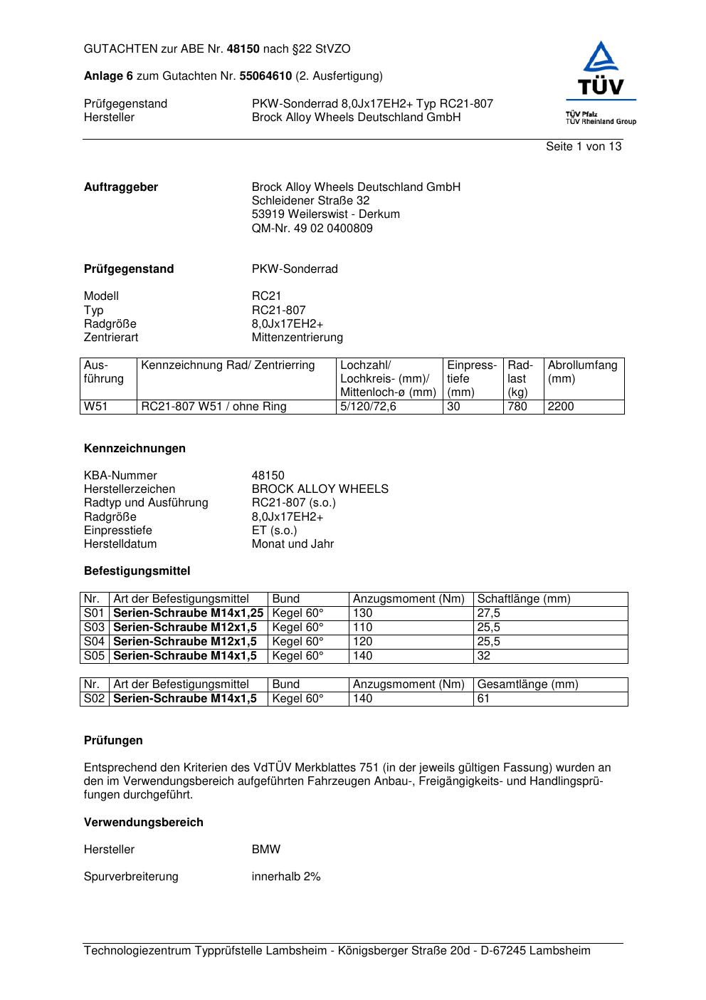 Dieses Gutachten (abe) bezieht sich auf die Alufelge Brock RC21-8 07 in der Ausführung 8Jx17 ET 0, Mittenloch 0 mm (KBA 48150). Im PDF findest du typischerweise zulässige Reifengrößen, Auflagen/Anbauhinweise und – je nach Dokument – Hinweise zur Eintragung.