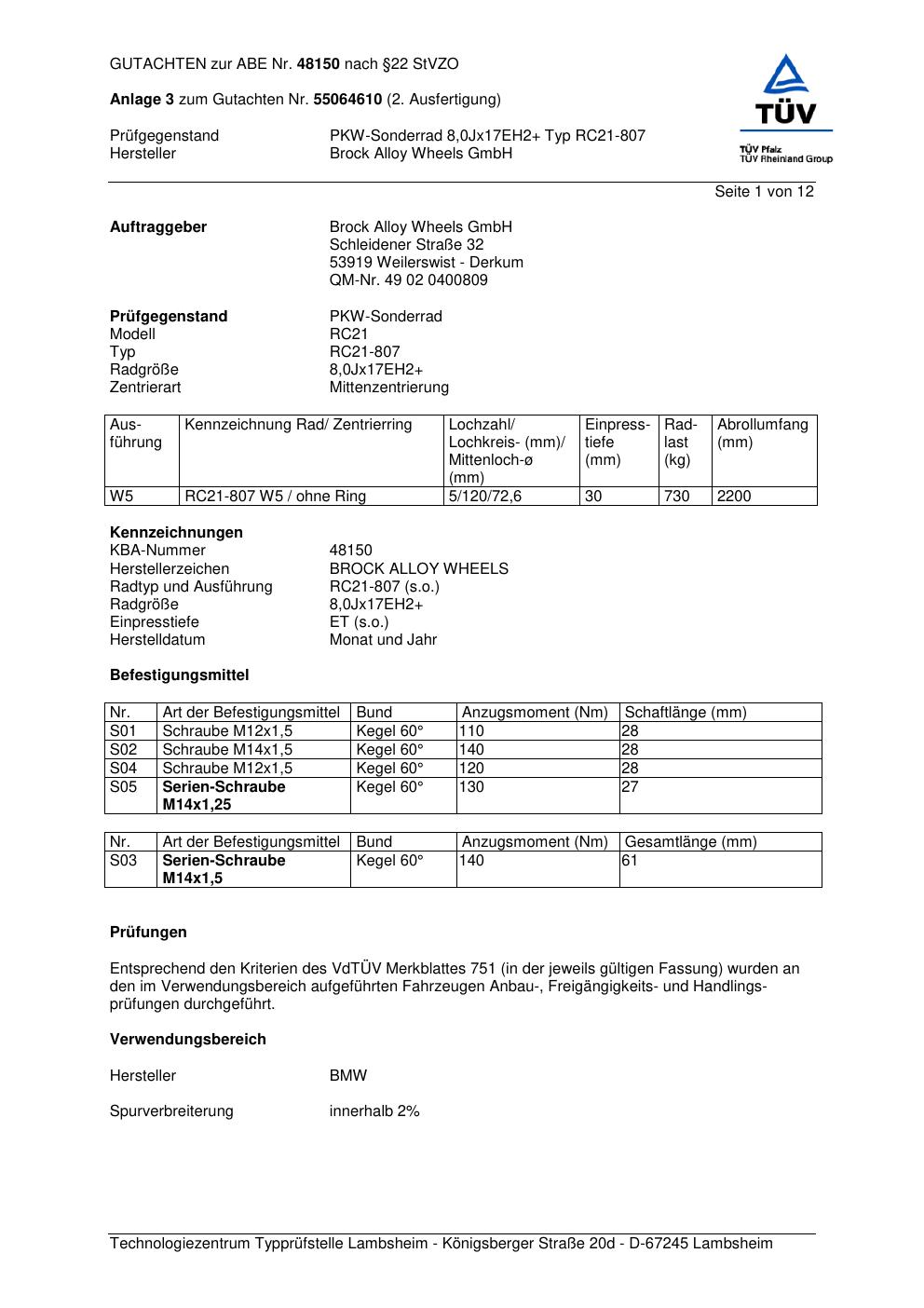 Dieses Gutachten (abe) bezieht sich auf die Alufelge Brock RC21-8 07 in der Ausführung ET 0, Mittenloch 0 mm (KBA 48150). Im PDF findest du typischerweise zulässige Reifengrößen, Auflagen/Anbauhinweise und – je nach Dokument – Hinweise zur Eintragung.