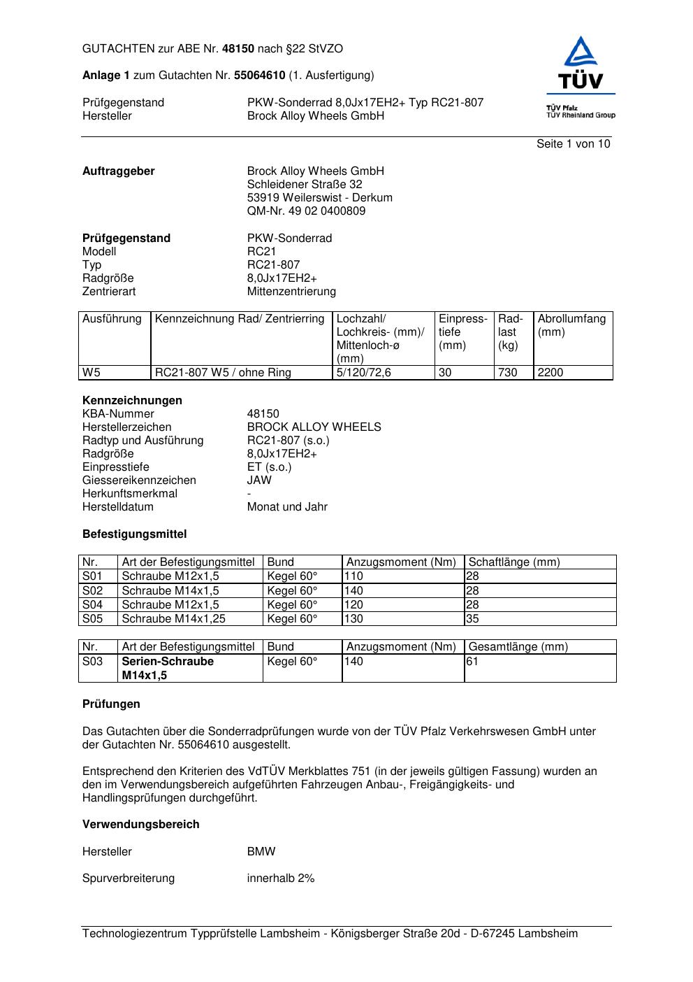 Dieses Gutachten (abe) bezieht sich auf die Alufelge Brock RC21-8 07 in der Ausführung ET 0, Mittenloch 0 mm (KBA 48150). Im PDF findest du typischerweise zulässige Reifengrößen, Auflagen/Anbauhinweise und – je nach Dokument – Hinweise zur Eintragung.