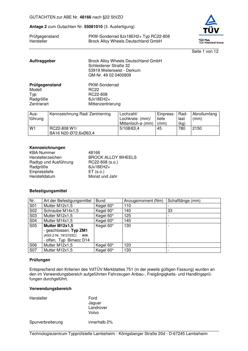 Dieses Gutachten (abe) bezieht sich auf die Alufelge Brock RC22-808 in der Ausführung ET 0, Mittenloch 0 mm (KBA 48166). Im PDF findest du typischerweise zulässige Reifengrößen, Auflagen/Anbauhinweise und – je nach Dokument – Hinweise zur Eintragung.