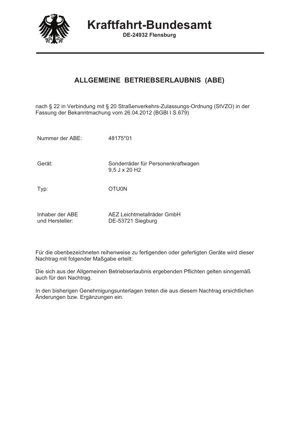 Dieses Gutachten (abe) bezieht sich auf die Alufelge brand-aez OTU0N in der Ausführung 9.5Jx2 ET 0, Mittenloch 0 mm (KBA 48175). Im PDF findest du typischerweise zulässige Reifengrößen, Auflagen/Anbauhinweise und – je nach Dokument – Hinweise zur Eintragung.