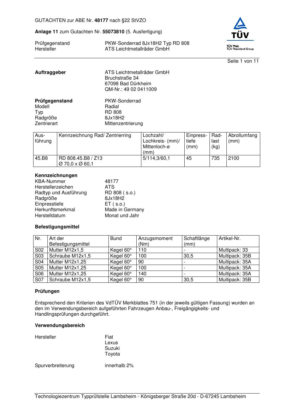 Dieses Gutachten (abe) bezieht sich auf die Alufelge ATS RD 808 in der Ausführung 8Jx18 ET 0, Mittenloch 0 mm (KBA 48177). Im PDF findest du typischerweise zulässige Reifengrößen, Auflagen/Anbauhinweise und – je nach Dokument – Hinweise zur Eintragung.