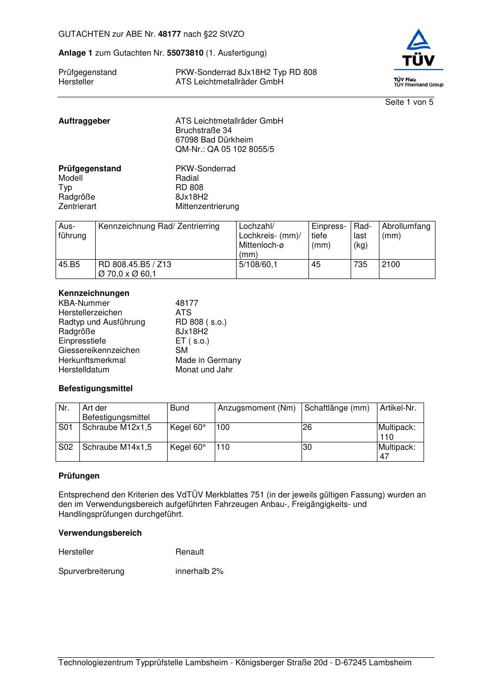 Dieses Gutachten (abe) bezieht sich auf die Alufelge ATS RD 808 in der Ausführung 8Jx18 ET 0, Mittenloch 0 mm (KBA 48177). Im PDF findest du typischerweise zulässige Reifengrößen, Auflagen/Anbauhinweise und – je nach Dokument – Hinweise zur Eintragung.